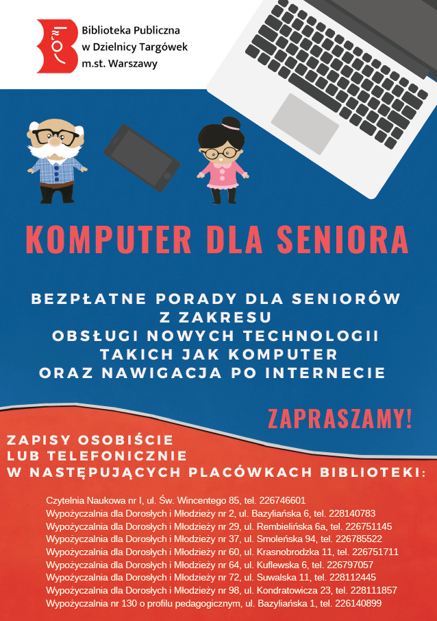 Biblioteka Publiczna w Dzielnicy Targówek m.st. Warszawy, zaprasza Seniorów na bezpłatne porady z zakresu obsługi nowych technologii, takich jak komputer oraz nawigacja po Internecie.