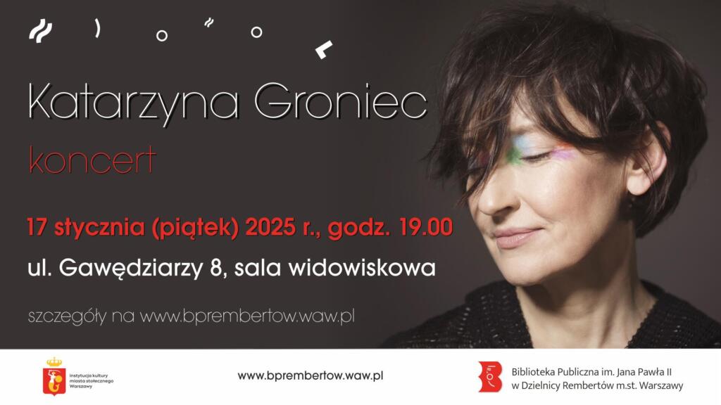 Katarzyna Groniec spotka się z rembertowską publicznością 17 stycznia o godzinie 19.00. Podczas występu zaprezentuje program „Bliżej”, czyli utwory od „Youkali” po „Konstelacje”, od Hemara po Osiecką – piosenki stare i nowe w kameralnej odsłonie. Artystce akompaniować będą Adam Skrzypek (bass, moog) oraz Robert Jarmużek (klawisze).