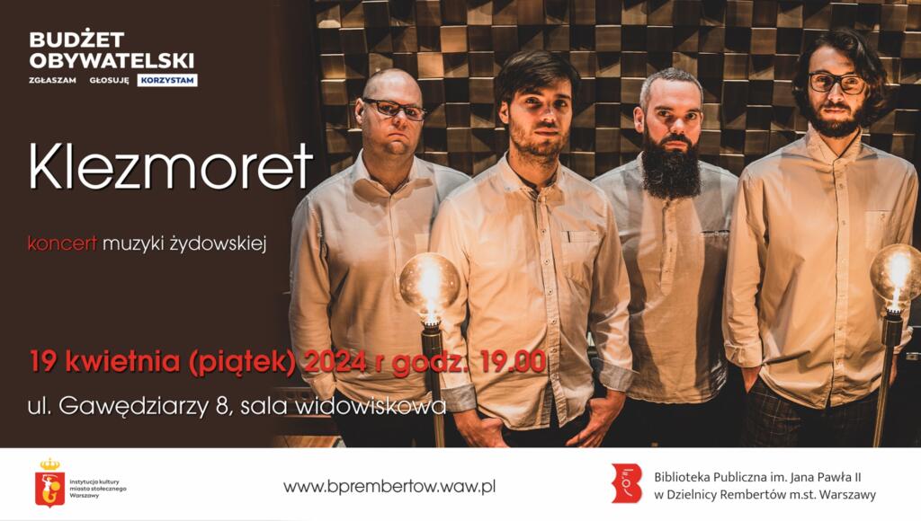 Mieszkańców dzielnicy czeka wieczór pełen magicznej muzyki. Już 19 kwietnia (piątek) o godz. 19.00 w sali widowiskowej biblioteki wystąpi zespół Klezmoret. To grupa pasjonatów muzyki żydowskiej, których twórczość wzbogacona jest o elementy bałkańskie, słowiańskie, jazzowe i współczesne. Ich koncerty to prawdziwa uczta dla zmysłów, pełna ekspresji i emocji.