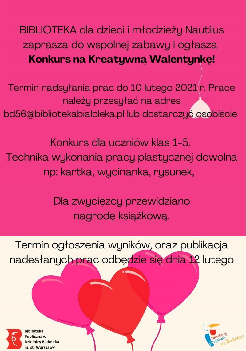 Biblioteka dla dzieci i młodzieży Nautilus zaprasza do wspólnej zabawy i ogłasza Konkurs na Kreatywną Walentynkę!