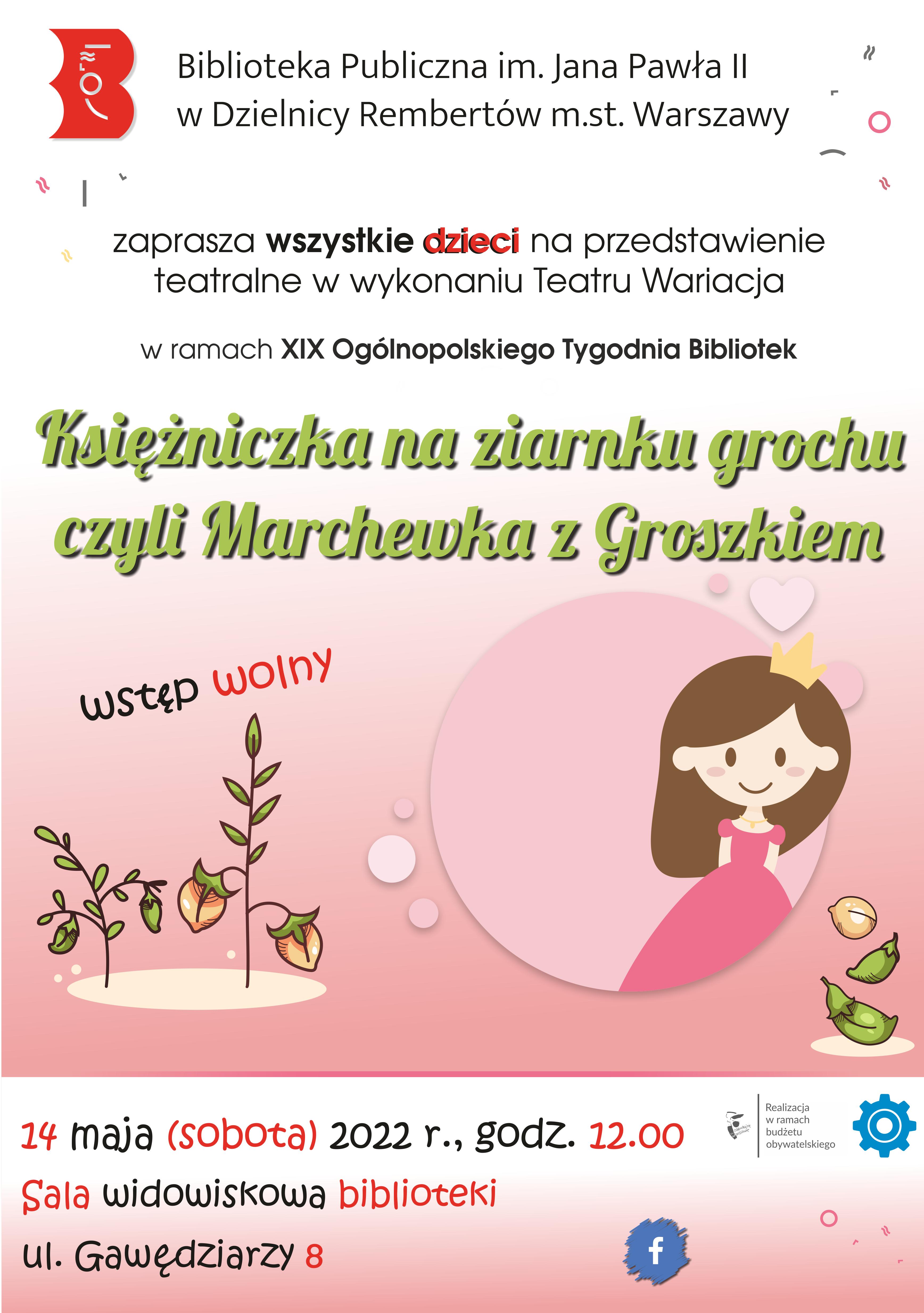 Z okazji Ogólnopolskiego Tygodnia Bibliotek, rembertowska biblioteka zaprasza wszystkie dzieci na przedstawienie pt. “Księżniczka na ziarnku grochu czyli Marchewka z Groszkiem”. Spektakl w wykonaniu aktorów Teatru Wariacja odbędzie się w sali widowiskowej biblioteki przy ul. Gawędziarzy 8, w sobotę 14 maja, o godz. 12:00.