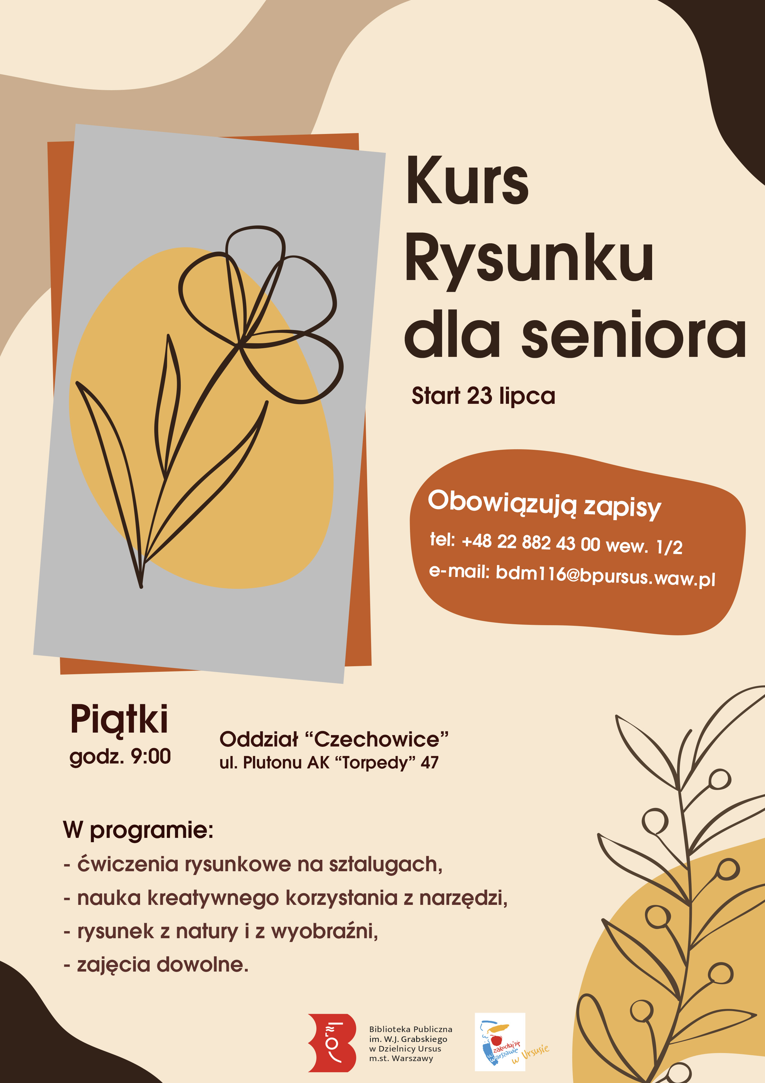 Biblioteka Publiczna w Dzielnicy Ursus serdecznie zaprasza seniorów do udziału w zajęciach z rysunku. Zajęcia startują 23 lipca i składają się z cyklu 6 spotkań. Kurs odbywać się będzie w piątki w godzinach 9:00-10:00.