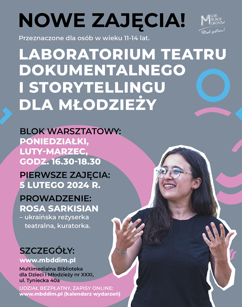 Nowe zajęcia dla młodzieży w Multimedialnej Bibliotece dla Dzieci i Młodzieży nr XXXI w Dzielnicy Mokotów. Zapraszamy na warsztaty teatru dokumentalnego i storytellingu, podczas których można nauczyć się, jak budować fascynujące opowieści, odkryć, jak wyrazić siebie poprzez sztukę, tworząc unikalne ilustracje do historii, razem z rówieśnikami stworzyć społeczność twórców, dzieląc się swoimi przeżyciami i doświadczeniami.