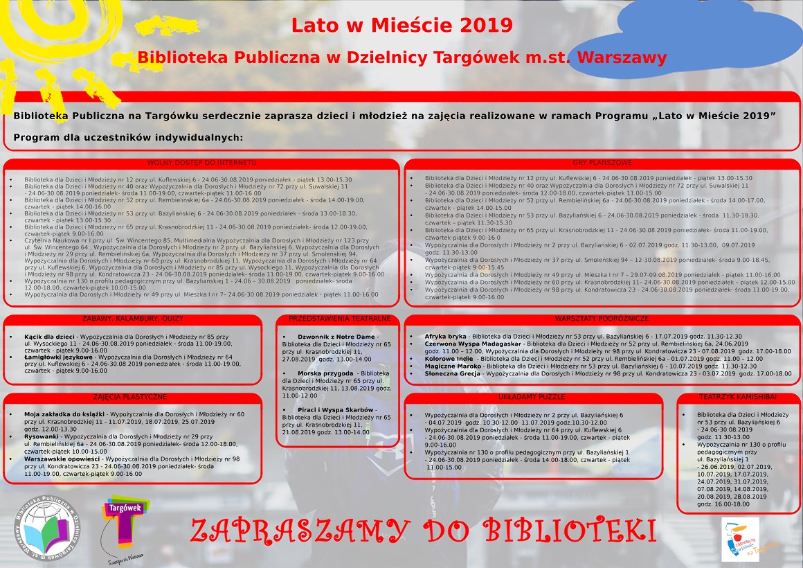 Biblioteka Publiczna w Dzielnicy Targówek m.st. Warszawy serdecznie zaprasza dzieci i młodzież na zajęcia realizowane w ramach programu „Lato w Mieście 2019”. Program dla uczestników indywidualnych: