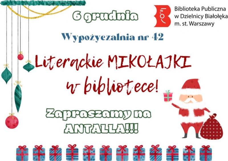 Wypożyczalnia Nr 42 serdecznie zaprasza do wzięcia udziału w zabawie mikołajkowej z nagrodami. Przyjdź do naszej biblioteki 6 grudnia, wypożycz przynajmniej jedną książkę, wylosuj pytanie i udziel poprawnej odpowiedzi.