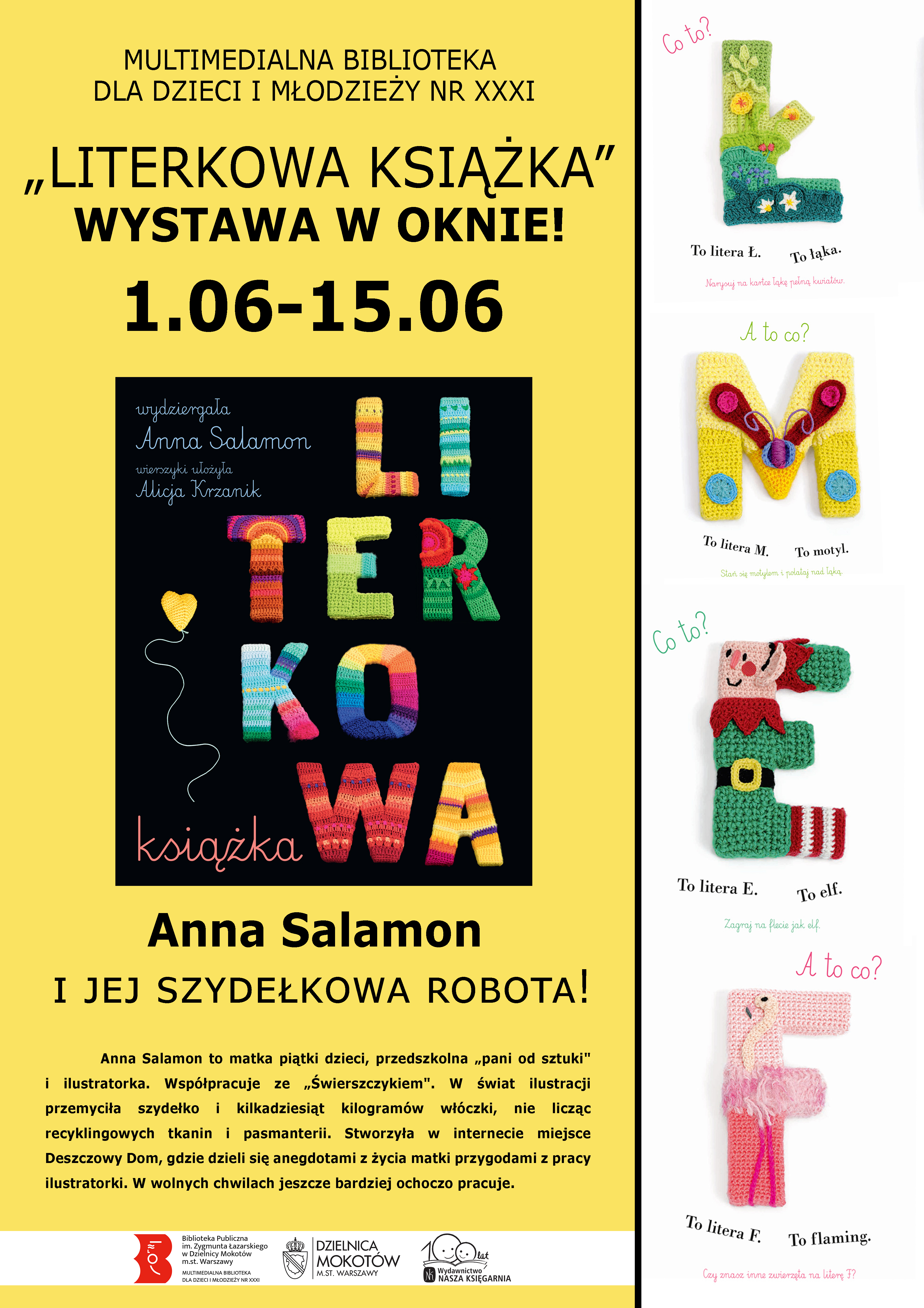 Anna Salamon „pani od sztuki” i ilustratorka współpracuje ze „Świerszczykiem”. W czarowny świat ilustracji autorka wprowadza szydełko i kilkadziesiąt kilogramów włóczki. Posługuje się również tkaniną i pasmanterią z recyklingu. W publikacji „Literkowa książka” oglądamy efekty swojej szydełkowej pracy.