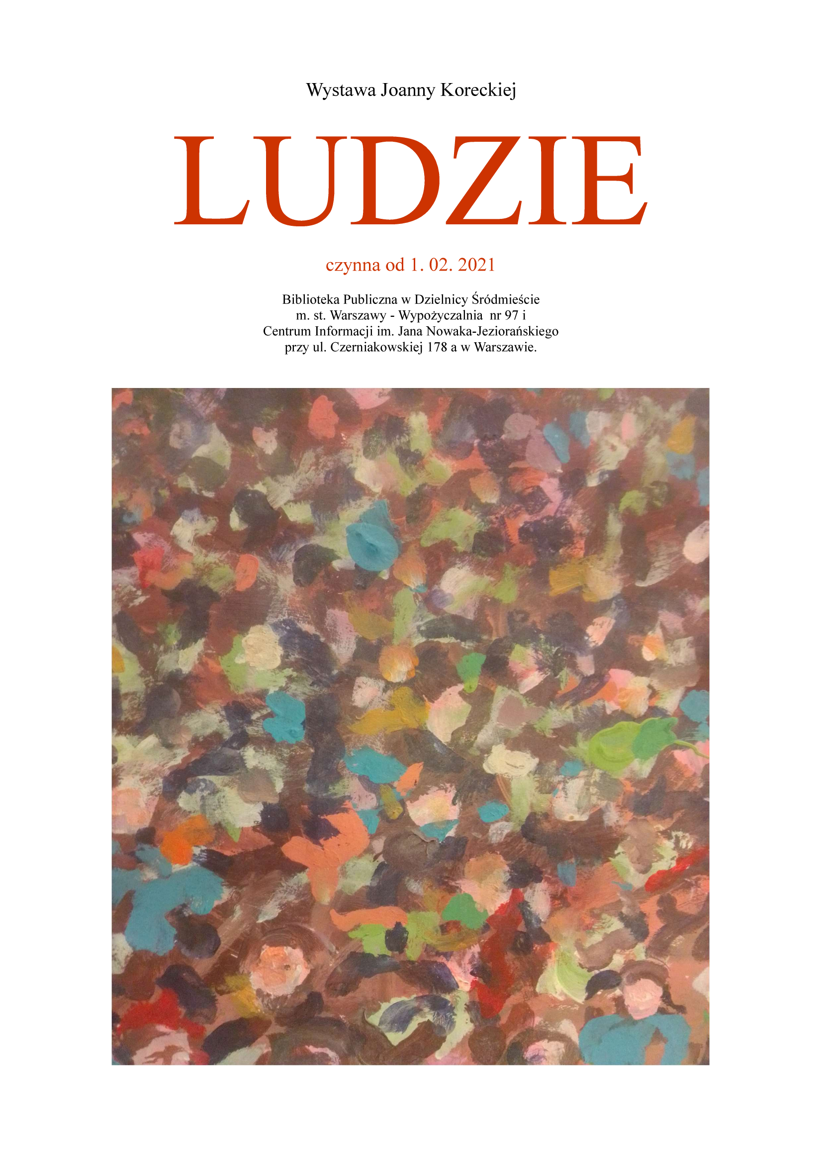 Biblioteka Publiczna w Dzielnicy Śródmieście m.st. Warszawy zaprasza do Wypożyczalni dla Dorosłych i Młodzieży nr 97 i Centrum Informacji im. Jana Nowaka-Jeziorańskiego przy ul. Czerniakowskiej 178a na wystawę prac pani Joanny Koreckiej pt.: „Ludzie. Dźwięki i obrazy”.