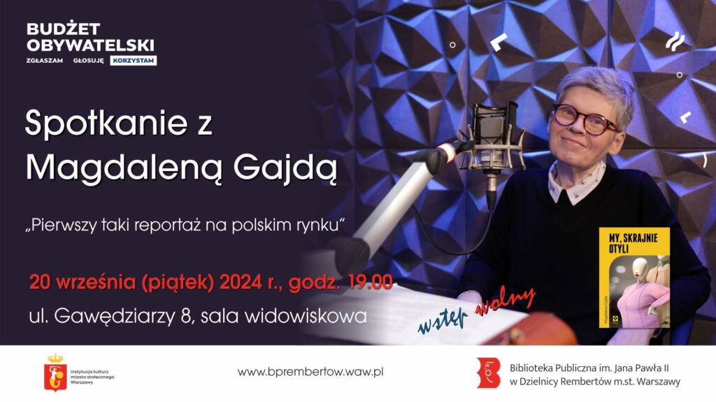 Serdecznie zapraszamy na spotkanie autorskie z Magdaleną Gajdą, autorką poruszającej książki „My, skrajnie otyli”, 20 września o godzinie 19.00 w sali widowiskowej przy ul. Gawędziarzy 8. To znakomita okazja, by osobiście poznać pisarkę, która odważnie podjęła temat skrajnej otyłości, opisując go w sposób szczery i bezkompromisowy. To bez wątpienia jedyna taka książka na polskim rynku wydawniczym!