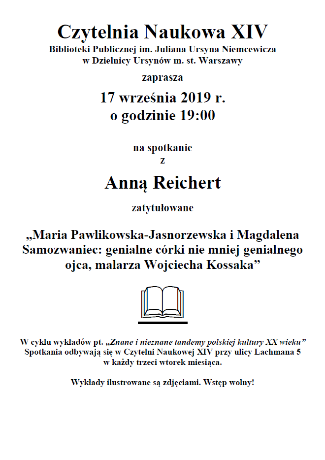 Czytelnia Naukowa nr XIV przy ul. Lachmana 5, zaprasza na kolejne spotkanie z Anną Reichert pt.: „Maria Pawlikowska-Jasnorzewska i Magdalena Samozwaniec: genialne córki nie mniej genialnego ojca, malarza Wojciecha Kossaka” w ramach cyklu „Znane i nieznane tandemy polskiej kultury XX wieku” w dniu 17 września (wtorek) o godzinie 19:00.