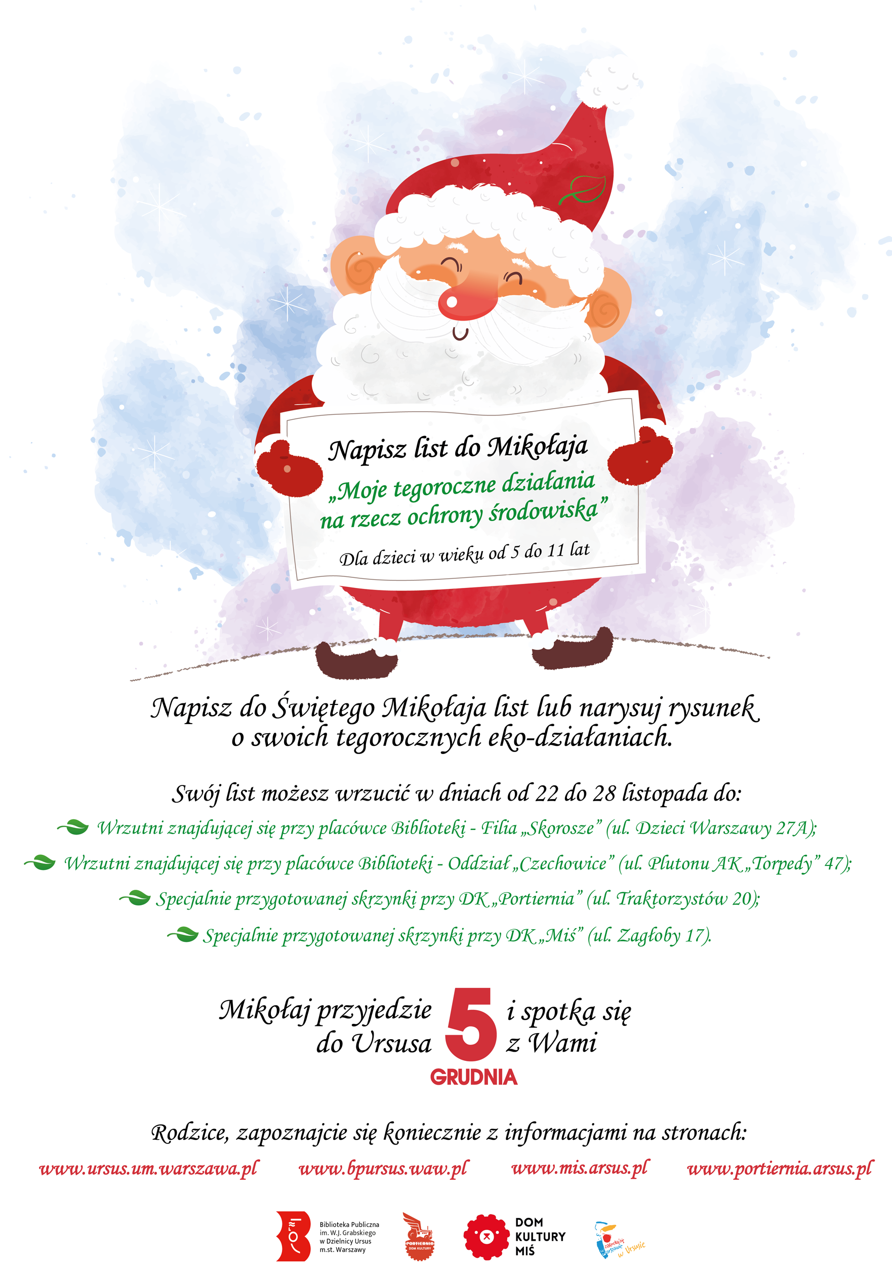 5 grudnia br. Biblioteka Publiczna, Ośrodek Kultury „Arsus” oraz Urząd Dzielnicy Ursus m.st. Warszawy serdecznie zapraszają wszystkich mieszkańców Ursusa do udziału w finale akcji „Eko-Mikołajki”. Wydarzenie poprzedzone będzie zbiórką listów do Mikołaja.