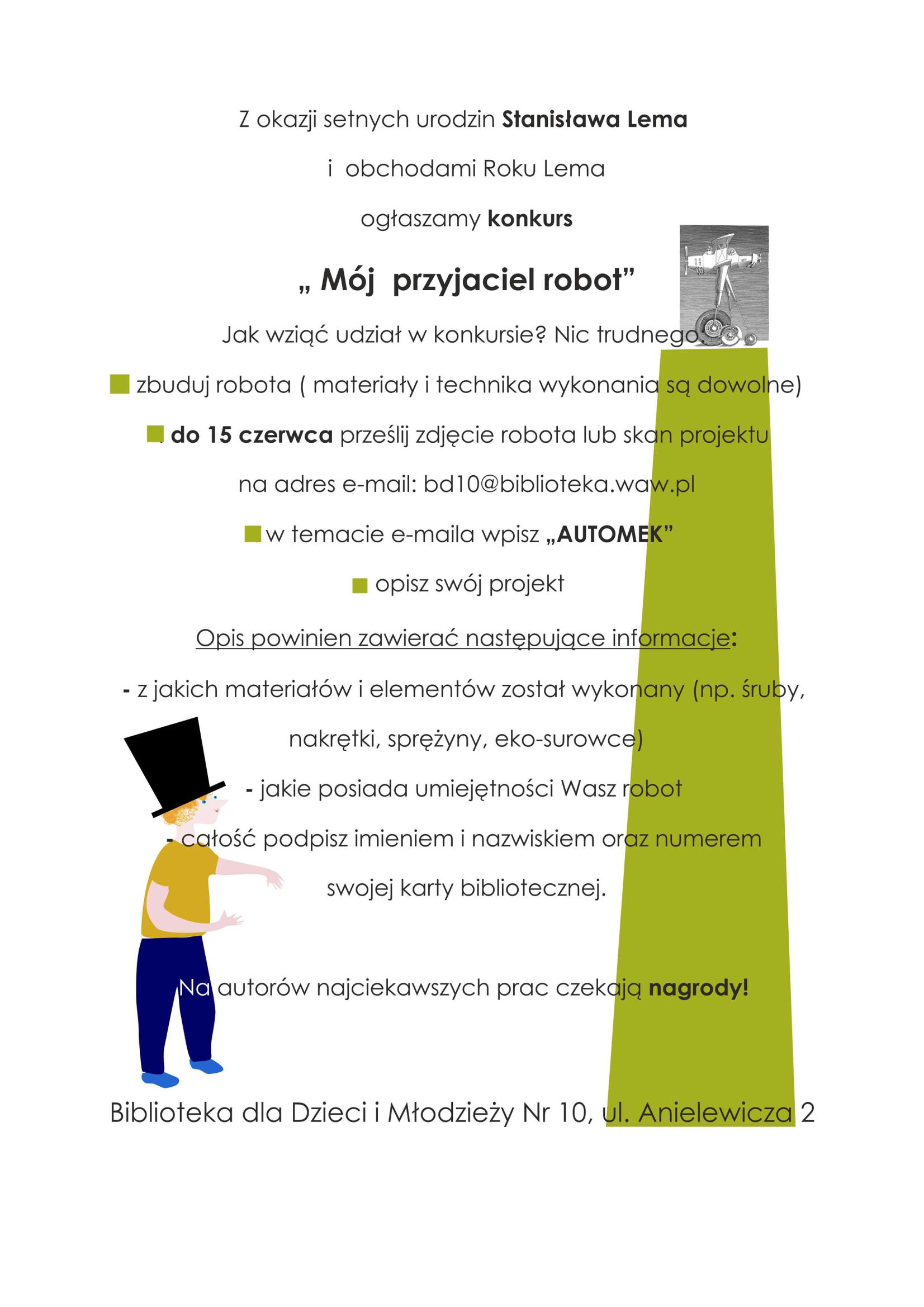 Z okazji setnych urodzin Stanisława Lema Biblioteka dla Dzieci i Młodzieży nr 10 przy ulicy Anielewicza 2 ogłasza konkurs „Mój przyjaciel robot”.