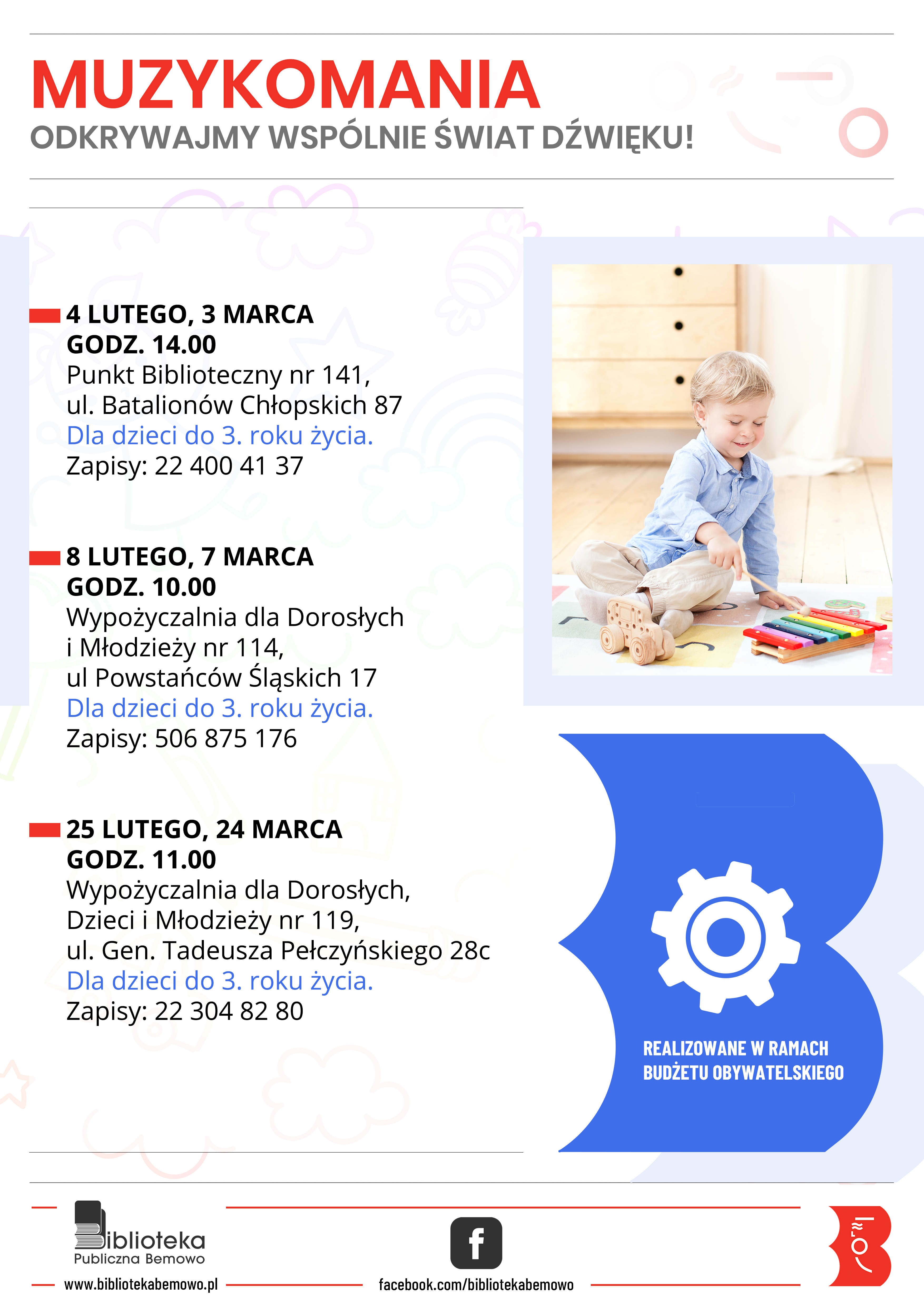 Zajęcia umuzykalniające dla niemowląt, małych dzieci i rodziców. Podczas zajęć będziemy poznawać polskie piosenki dla dzieci, muzykę ludową, klasyczną (Mozart, Bach), filmową. Będziemy improwizować, wyrażać muzykę poprzez ruch, klaskać, tańczyć, śpiewać i grać na prostych instrumentach.