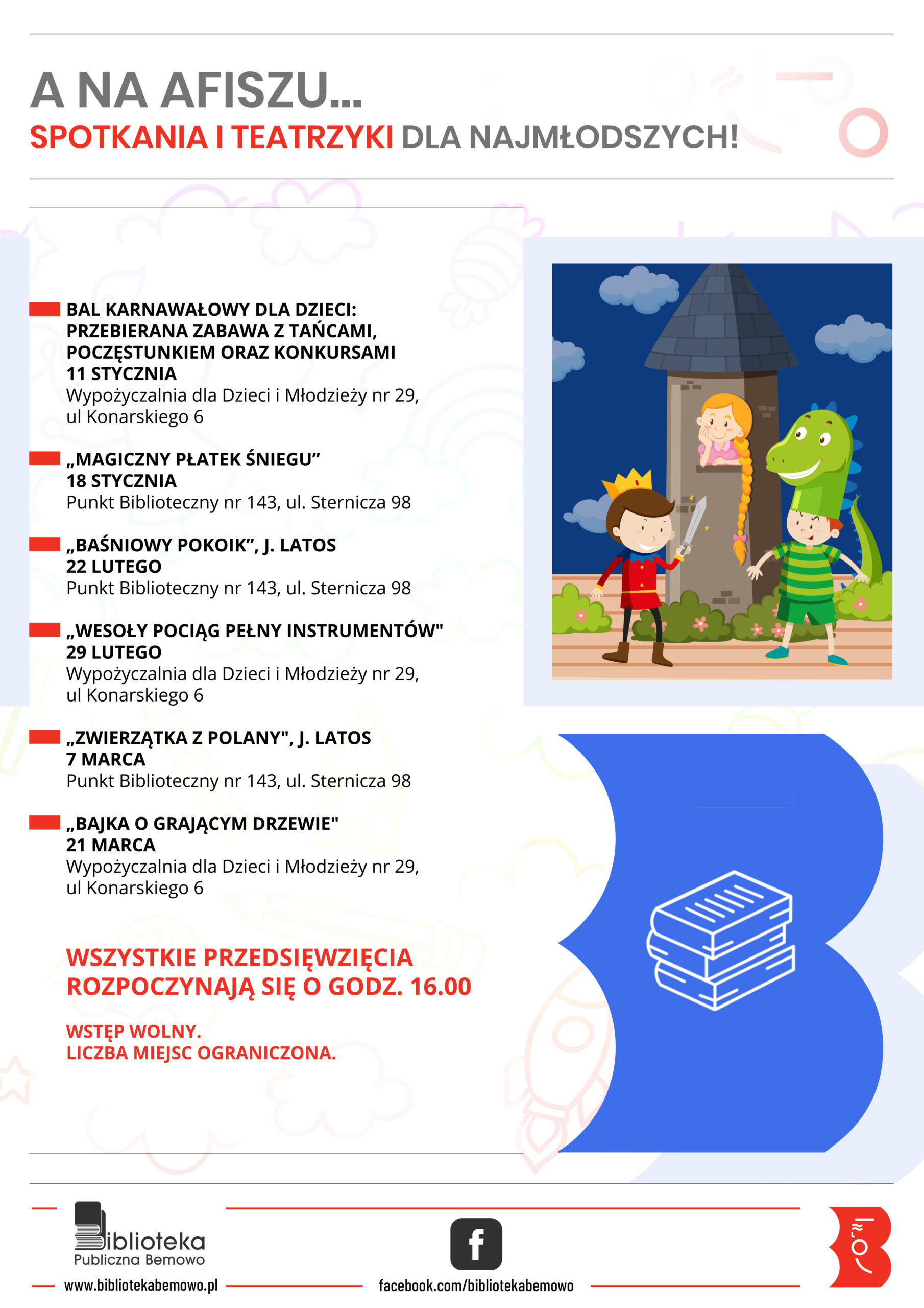 Na luty i marzec zaplanowaliśmy dla najmłodszych przedstawienia teatralne. Będą opowieści o magicznym płatku śniegu, baśniowym pokoju i inne.