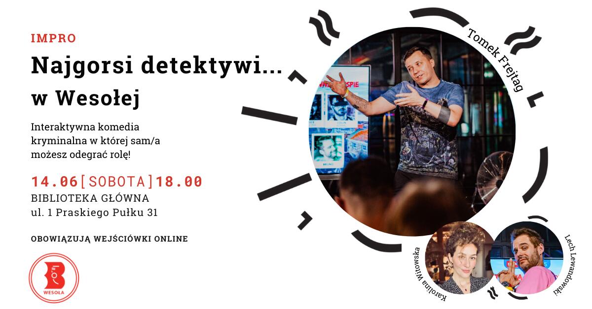 “Najgorsi detektywi” to impro połączone z wcielaniem się w role w dynamicznej i interaktywnej rozrywce. Prowadzący kieruje akcją, a aktorzy-improwizatorzy razem z publicznością tworzą niesamowite i nieprzewidywalne (oraz często kuriozalne) sytuacje. To improwizowane przedstawienie, w którym jako publiczność stajecie się kluczowymi bohaterami kryminalno-komediowej intrygi. Akcja rozwija się na bieżąco, a wszystko zależy od pomysłów i decyzji widowni. To pełna humoru zabawa, która angażuje wszystkich obecnych!