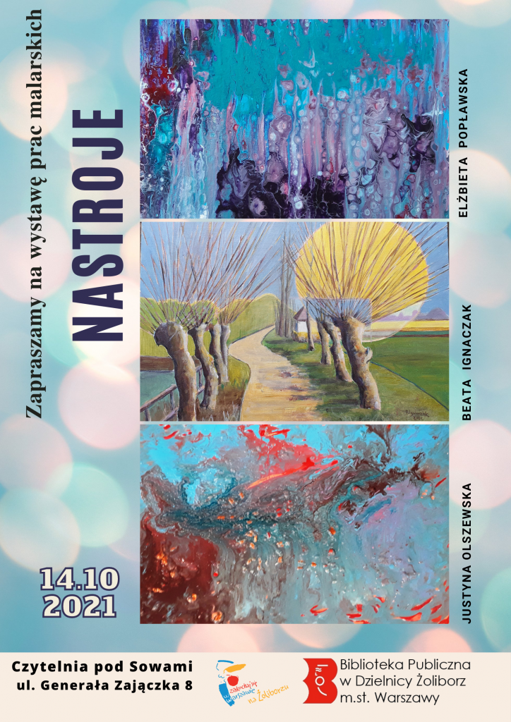 Zapraszamy na wystawę malarstwa zorganizowaną w Czytelni Pod Sowami przy ulicy Zajączka 8 od dnia 14 października do 8 listopada 2021 r. w godzinach otwarcia czytelni.