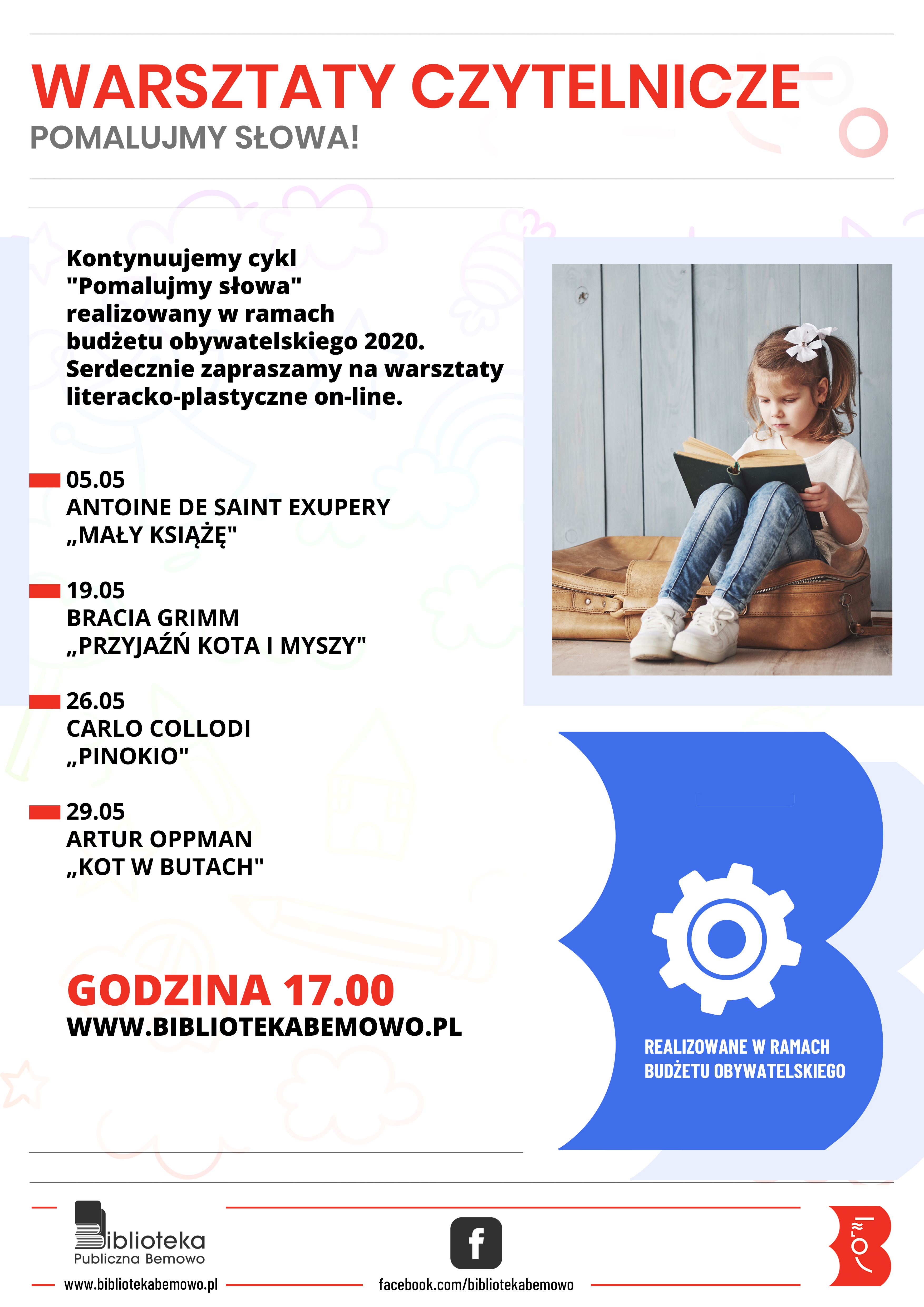 W maju Biblioteka na Bemowie zaprasza na kolejne warsztaty realizowane z Budżetu Obywatelskiego 2020. „Pomalujmy słowa” – to warsztaty literacko-plastyczne, podczas których Bibliotekarze przeczytają wybraną książkę i zaproponują zabawę plastyczną związaną z jej tematem.