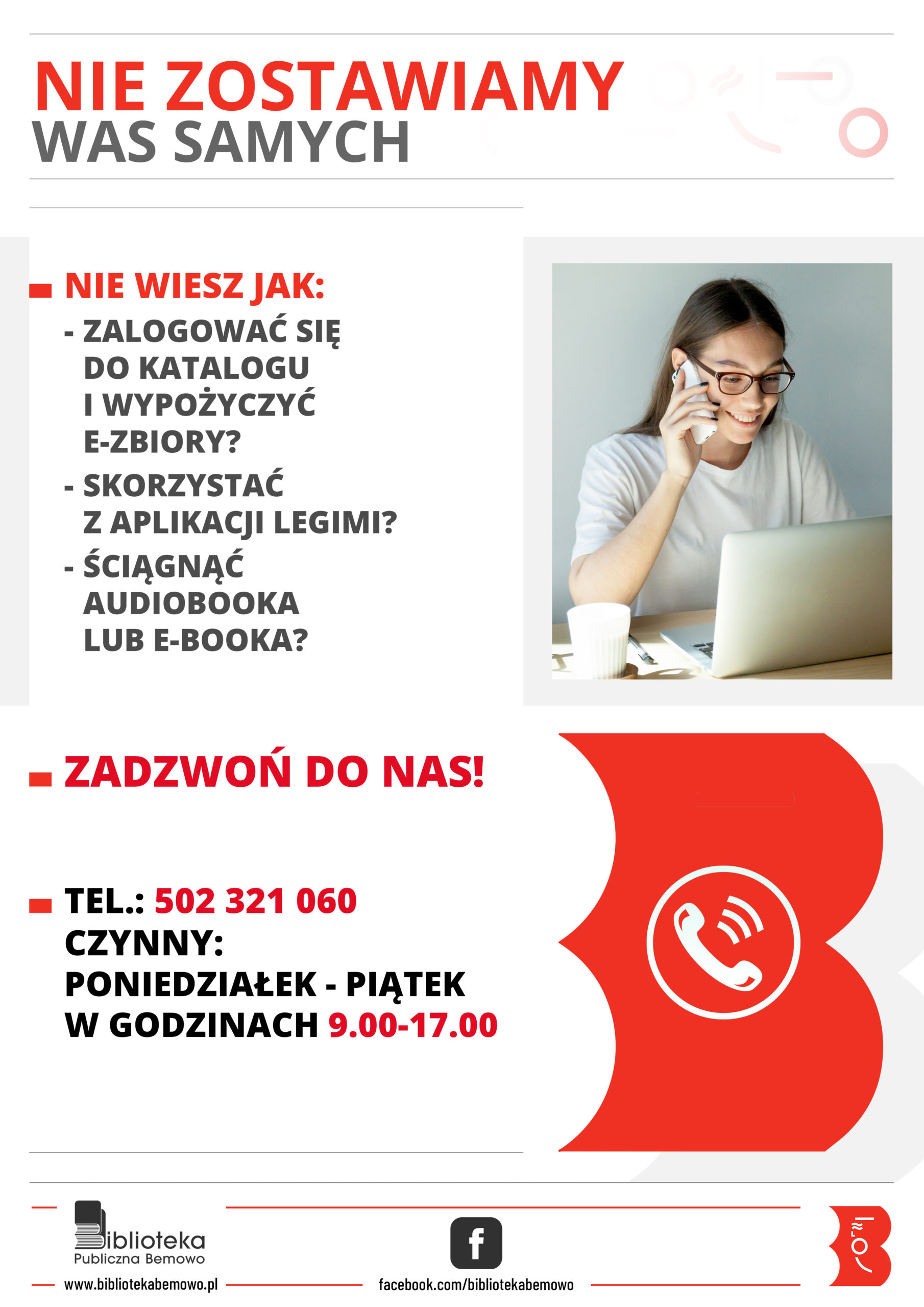 Biblioteka na Bemowie zachęca do skorzystania z pomocy, informacji, porad udzielanych przez Bibliotekarzy w rozmowie telefonicznej. Jeśli macie problem ze znalezieniem pozycji w katalogu, nie możecie zalogować się na konto lub nie wiecie, jak dokonać video zapisu – chętnie rozwiejemy te wątpliwości i odpowiemy na wszelkie pytania.