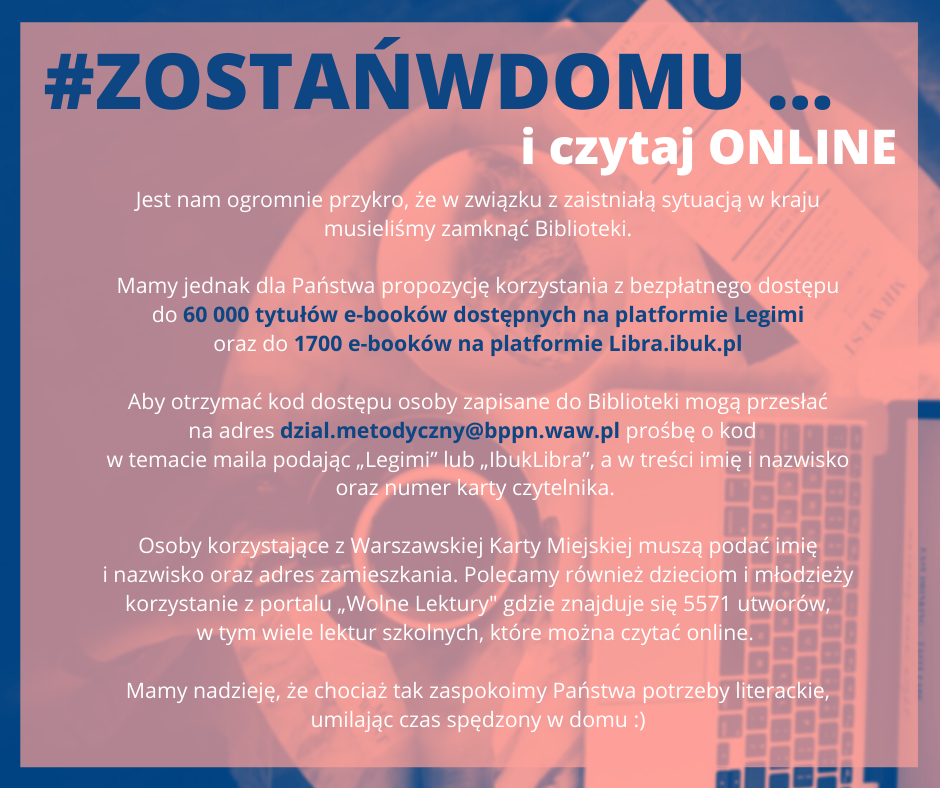 Mamy jednak dla Państwa propozycję korzystania z bezpłatnego dostępu do 60 000 tytułów e-booków, dostępnych na platformie Legimi oraz do 1700 e-booków na platformie Libra.ibuk.pl.