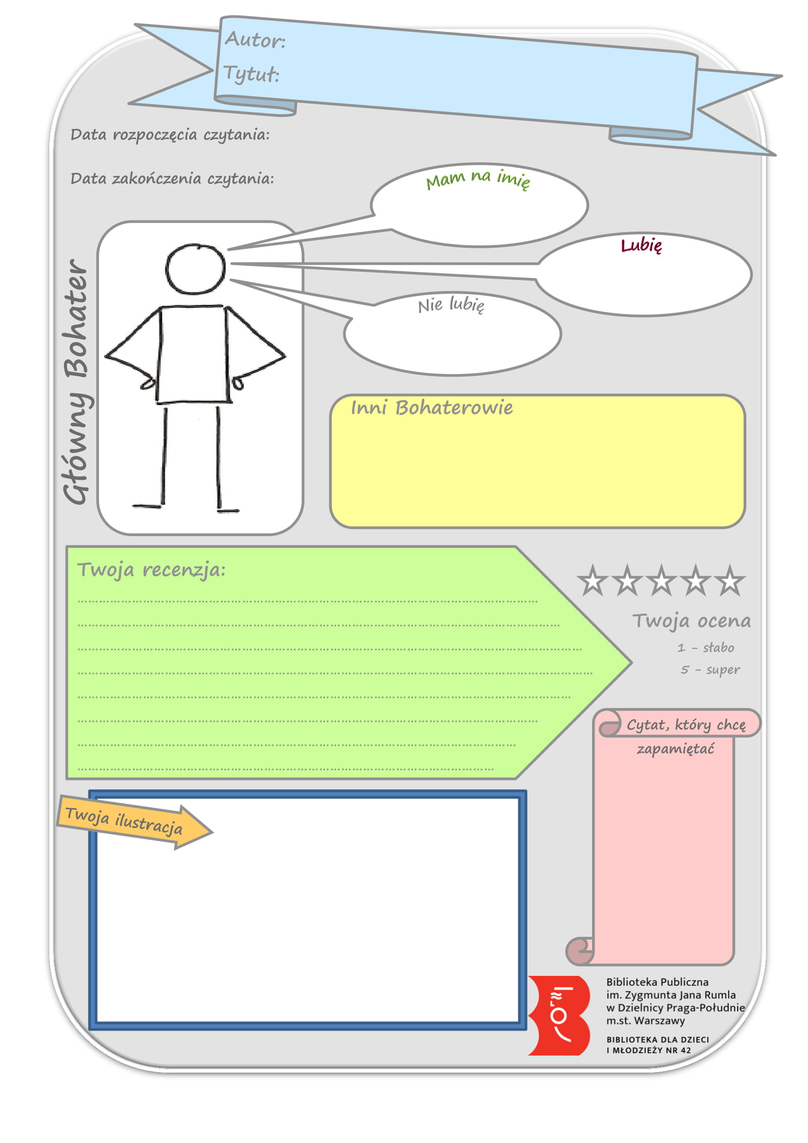 - Zachęcamy również Najmłodszych do założenia Dziennika Czytelnika! To działanie, którego pomysłodawczynią jest p. Monika Szymańska z Biblioteki dla Dzieci i Młodzieży nr 42. Jest to zeszyt, w którym można zapisywać tytuły przeczytanych książek, cytaty, przemyślenia na temat ich treści, można również rysować bohaterów – zamieszczać wszystko, co tylko Małym Czytelnikom przyjdzie do głowy! Poniżej publikujemy przykładową Kartę Recenzji Książki do wydrukowania.