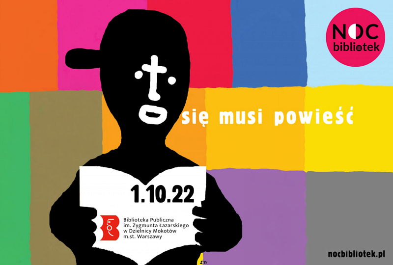 W tle rozsypane kolorowe kwadraty i prostokąty. Z lewej czarna sylwetka czytająca białe kartki. Na kartkach napis 1 10 22 biblioteka publiczna imienia Zygmunta Łazarskiego w dzielnicy Mokotów miasta stołecznego Warszawy. Twarz układa się w słowo to. A na prawo od twarzy słowa się musi powieść. Na prawo u góry w czerwonym kółku napis noc bibliotek. Na dole z prawej link nocbibliotek kropka pl.