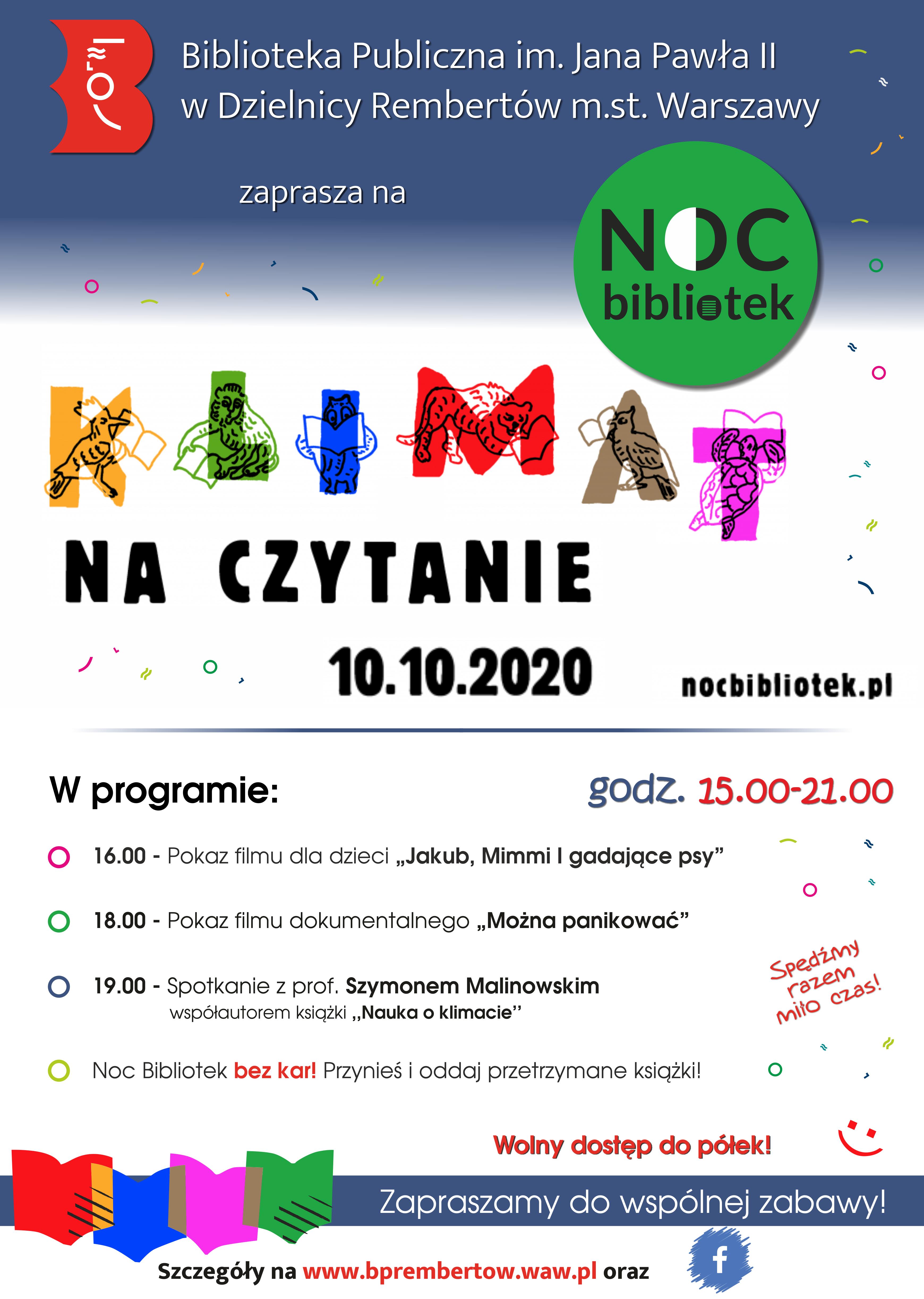 Noc Bibliotek to ogólnopolska akcja, która promuje kulturę, lokalne biblioteki i zachęca do korzystania ze zbiorów. Jest to oryginalny sposób, aby użytkownicy poznali najbardziej otwarte i dostępne instytucje kultury, jakimi są biblioteki. Podczas tegorocznego wydarzenia, adresowanego do użytkowników w każdym wieku będzie bardzo klimatycznie. Oczywiście podczas trwania Nocy Bibliotek będzie można wypożyczyć książki, a także zapisać się do Biblioteki. Tego wieczoru we wszystkich wypożyczalniach nie będą pobierane opłaty za zwrot książek po terminie! Zaś po uprzednim zdezynfekowaniu rąk, możliwy również będzie  wolny dostęp do półek.