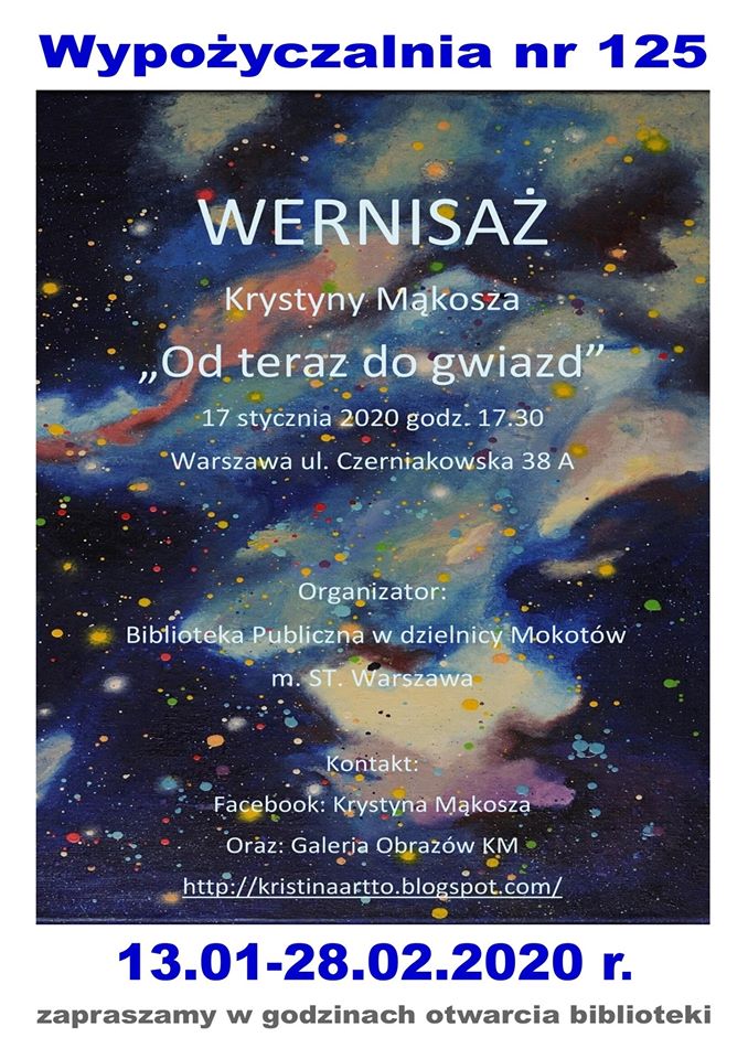Zapraszamy na wystawę malarstwa Krystyny Mąkosza „Od teraz do gwiazd” do Małej Galerii w Wypożyczalni nr 125.