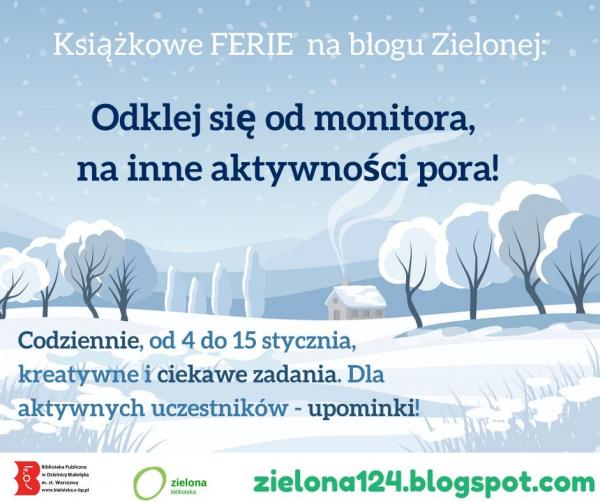 Zapraszamy naszych młodych czytelników na książkowe ferie na blogu Zielonej. Chcemy zachęcić Was do prostych, ale ciekawych i twórczych zabaw, do których nie będziecie potrzebowali komputerów i smartfonów, tylko otwartych głów i chęci do działania. Hasło ferii: Odklej się od monitora, na inne aktywności pora!
