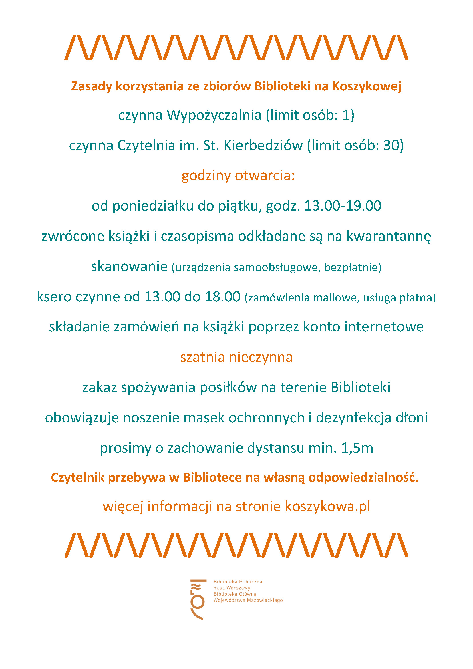 - W przypadku czasopism oraz zbiorów z katalogu zeskanowanego rekomendujemy wcześniejsze upewnienie się czy zbiory te nie są poddane kwarantannie. Prosimy wysyłać zapytania na adres: informatorium@koszykowa.pl.