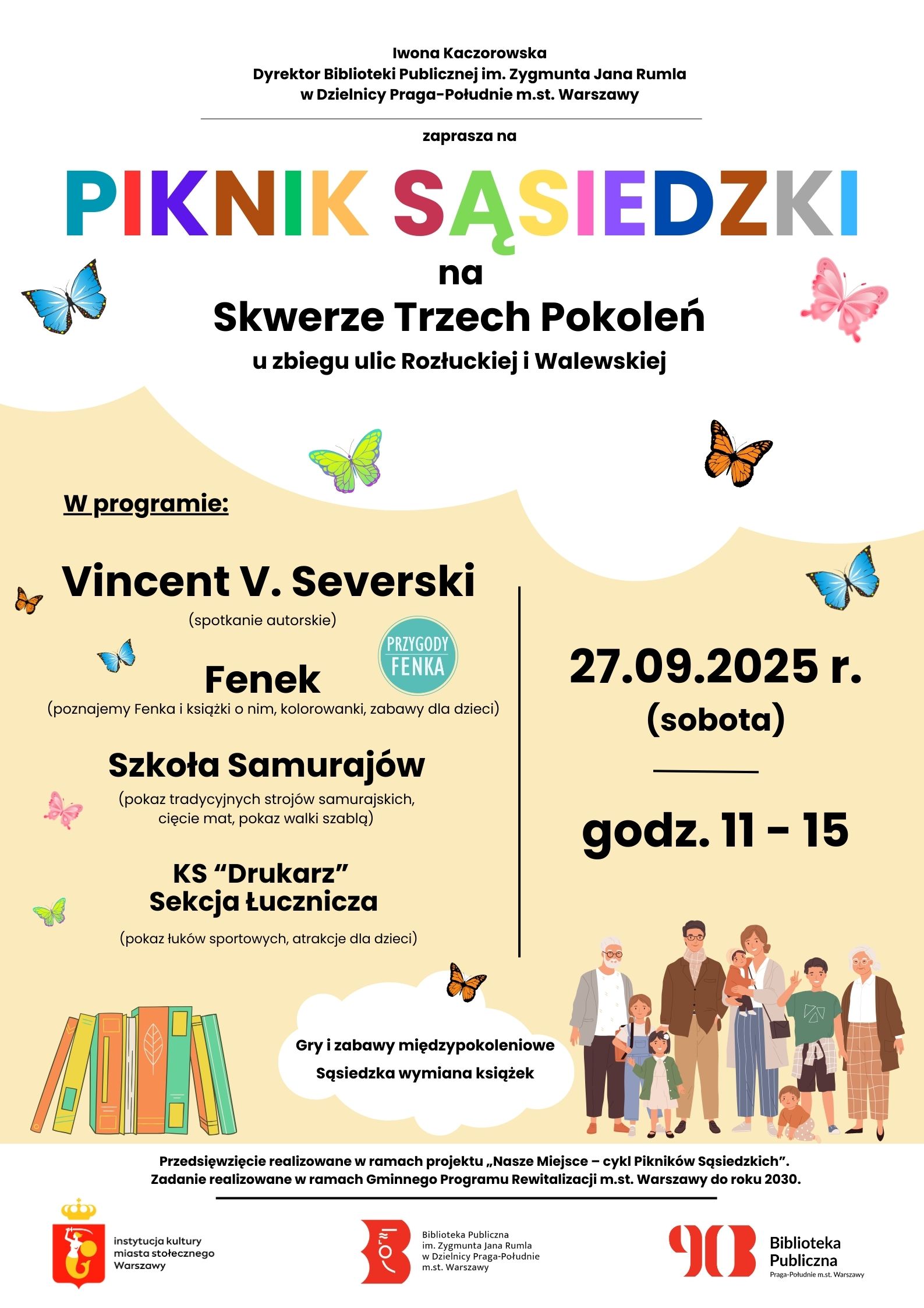 Biblioteka Publiczna Praga-Południe zaprasza do udziału w sąsiedzkim pikniku bibliotecznym na Skwerze Trzech Pokoleń (zbieg ulic Rozłuckiej i Walewskiej), który odbędzie się w sobotę 27 września w godz. 11:00-15:00.