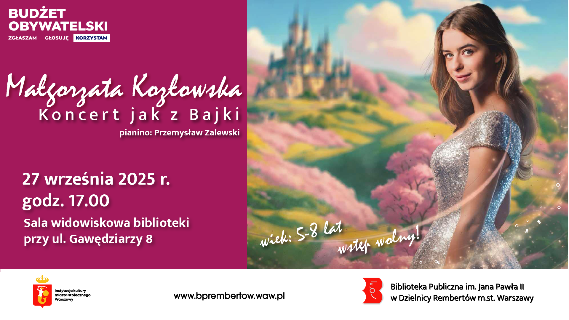 Magiczne wydarzenie pełne muzyki, uśmiechu i bajkowej atmosfery rozpocznie jesień w bibliotece. „Koncert jak z bajki" w wykonaniu Małgorzaty Kozłowskiej odbędzie się w sali widowiskowej, w sobotę 27 września o godz. 17:00.