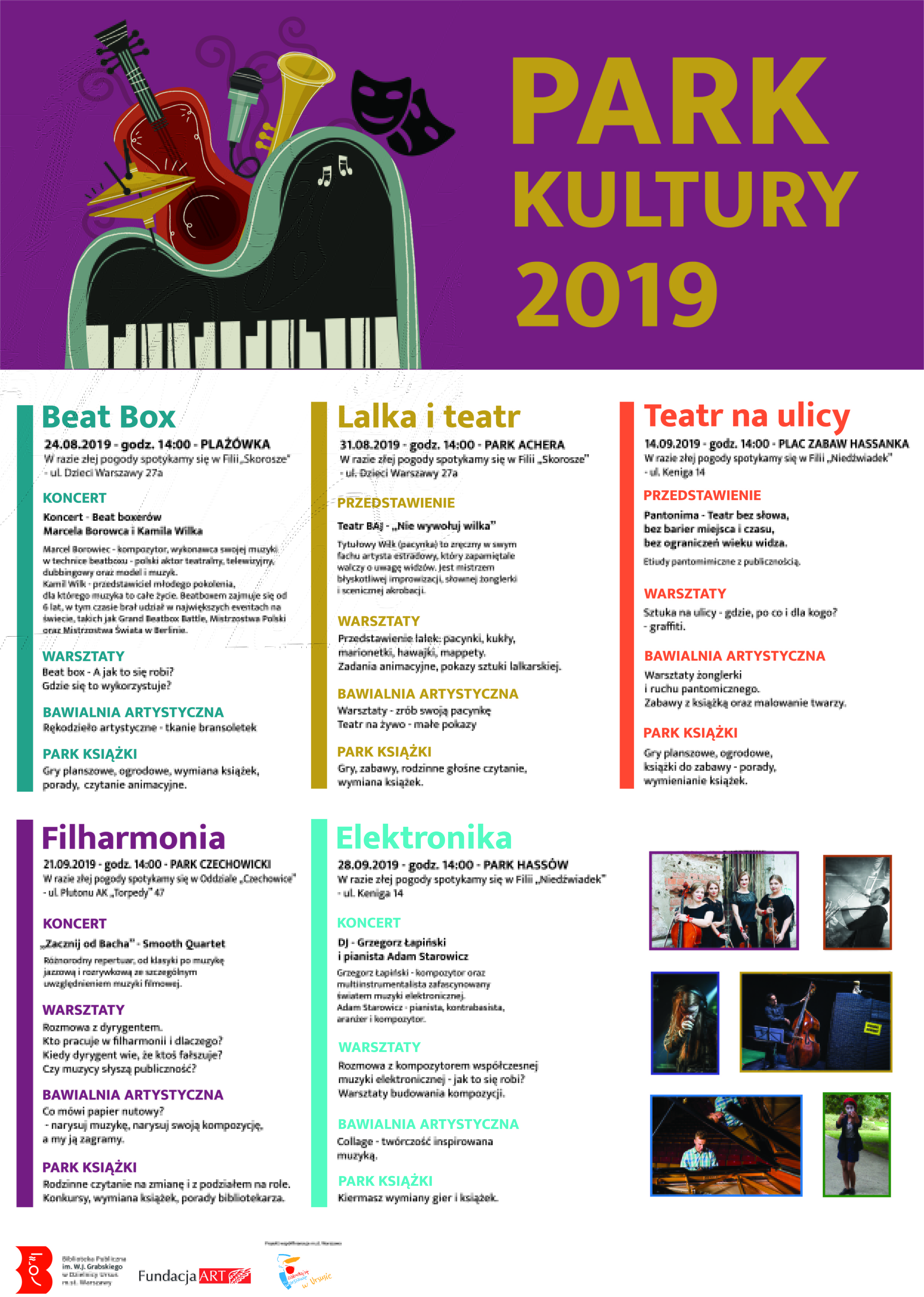 Biblioteka Publiczna im. W. J. Grabskiego w Ursusie, Fundacja Art oraz Urząd Dzielnicy Ursus, zapraszają na spotkania z kulturą w ramach projektu Park Kultury 2019.