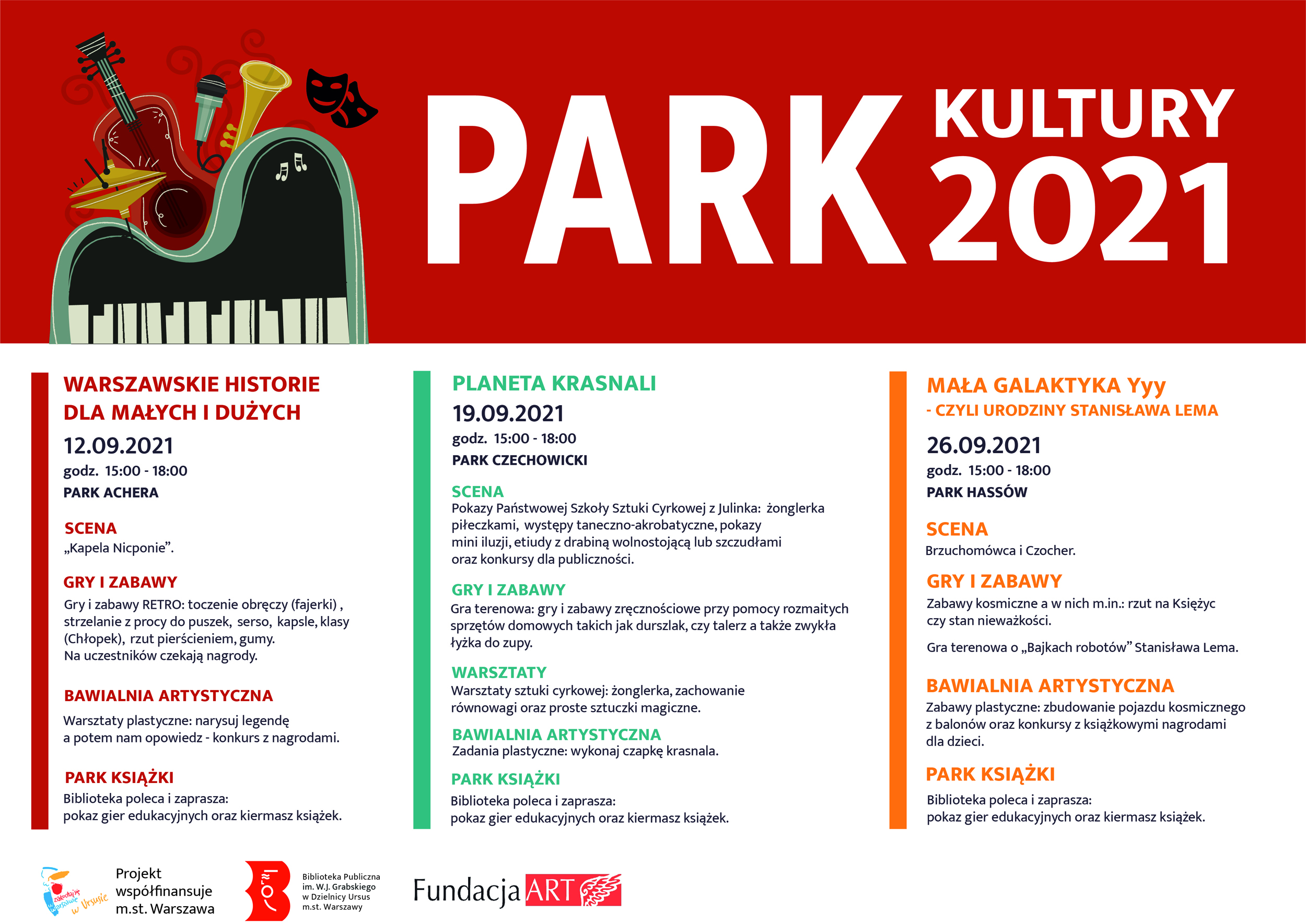 Biblioteka Publiczna w Ursusie, Fundacja Art oraz Urząd Dzielnicy Ursus, zapraszają na spotkania z kulturą w ramach projektu „Park Kultury 2021”, który jest kontynuacją cieszących się bardzo dużym zainteresowaniem ubiegłorocznych edycji. Podczas eventów w parkach Dzielnicy Ursus na wielkiej scenie zobaczymy przedstawienia teatralne i taneczne, pokazy żonglerki oraz koncerty. Na młodszych uczestników czekać będą dodatkowo warsztaty plastyczne, gry i zabawy, animacje kuglarskie oraz konkursy. W „Parku książki” bibliotekarze zaproszą na pokaz gier edukacyjnych oraz kiermasz książek. Zachęcamy do wymiany bookcrossingowej.