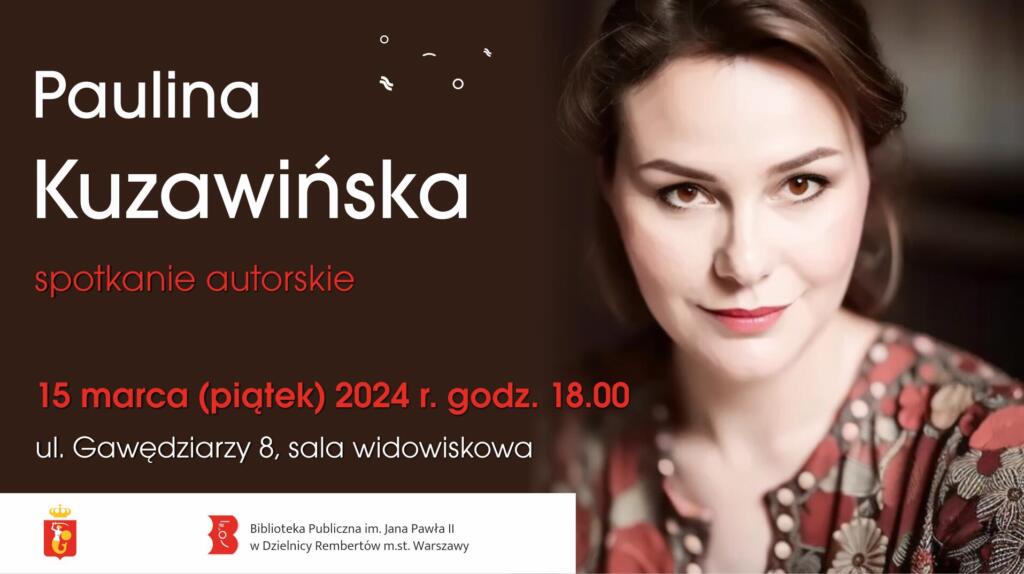 Spotkanie autorskie z Pauliną Kuzawińską odbędzie się 15 marca 2024 roku (piątek) o godzinie 18:00 w sali widowiskowej Biblioteki przy ul. Gawędziarzy 8.  Po spotkaniu czytelnicy będą mieli okazję zadać autorce pytania i porozmawiać z nią przy poczęstunku. Dodatkowo spośród obecnych zostanie wylosowana osoba, która otrzyma od samej autorki egzemplarz książki „Czarownica”.