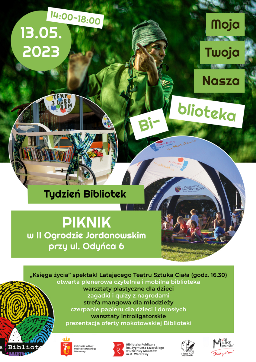 13 maja w godzinach 14:00-18:00 zachęcamy młodszych i starszych Czytelników do udziału w pikniku, który Biblioteka Mokotów organizuje w II Ogrodzie Jordanowskim (przy ul. Odyńca 6)!
