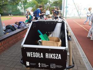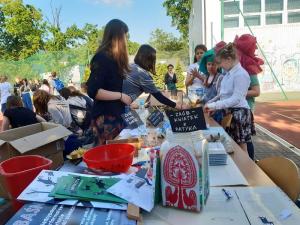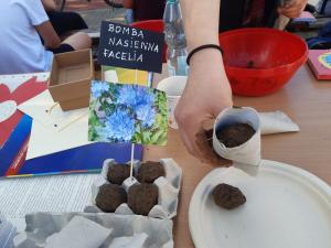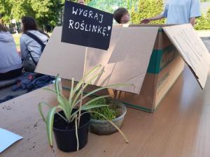 Na naszym stoisku rządzili siódmoklasiści. Kolejka w konkursie ekologicznym była duża. Około 60 nagród – roślin rozeszło się bardzo szybko 🙂 Cieszyły się ogromnym powodzeniem wśród młodzieży. Towarzyszyła nam Wesoła Riksza. Wszystkie materiały pochodziły z odzysku, wyprodukowaliśmy minimum śmieci, a zabawa była znakomita.