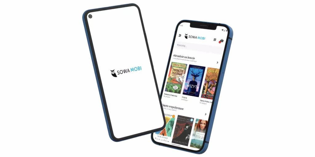 dwa smartfony - na jednym logo aplikacji Sowa Mobi, na drugim strona główna aplikacji Sowa Mobi z okładkami książek