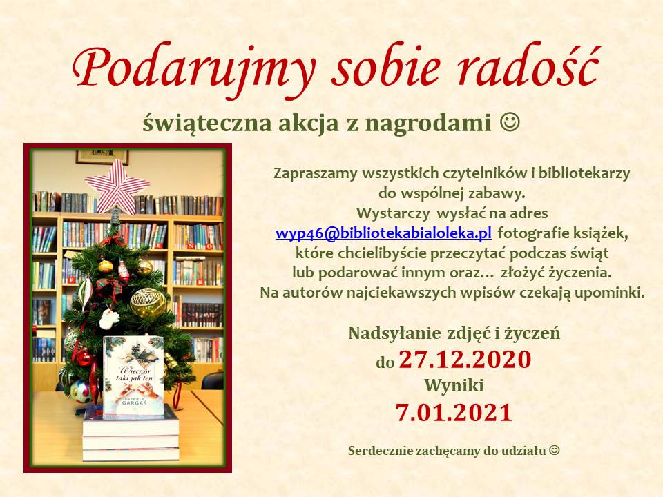 Wypożyczalnia Nr 46 zaprasza wszystkich czytelników do wspólnej zabawy „Podarujmy sobie radość! Świąteczna akcja z nagrodami”.