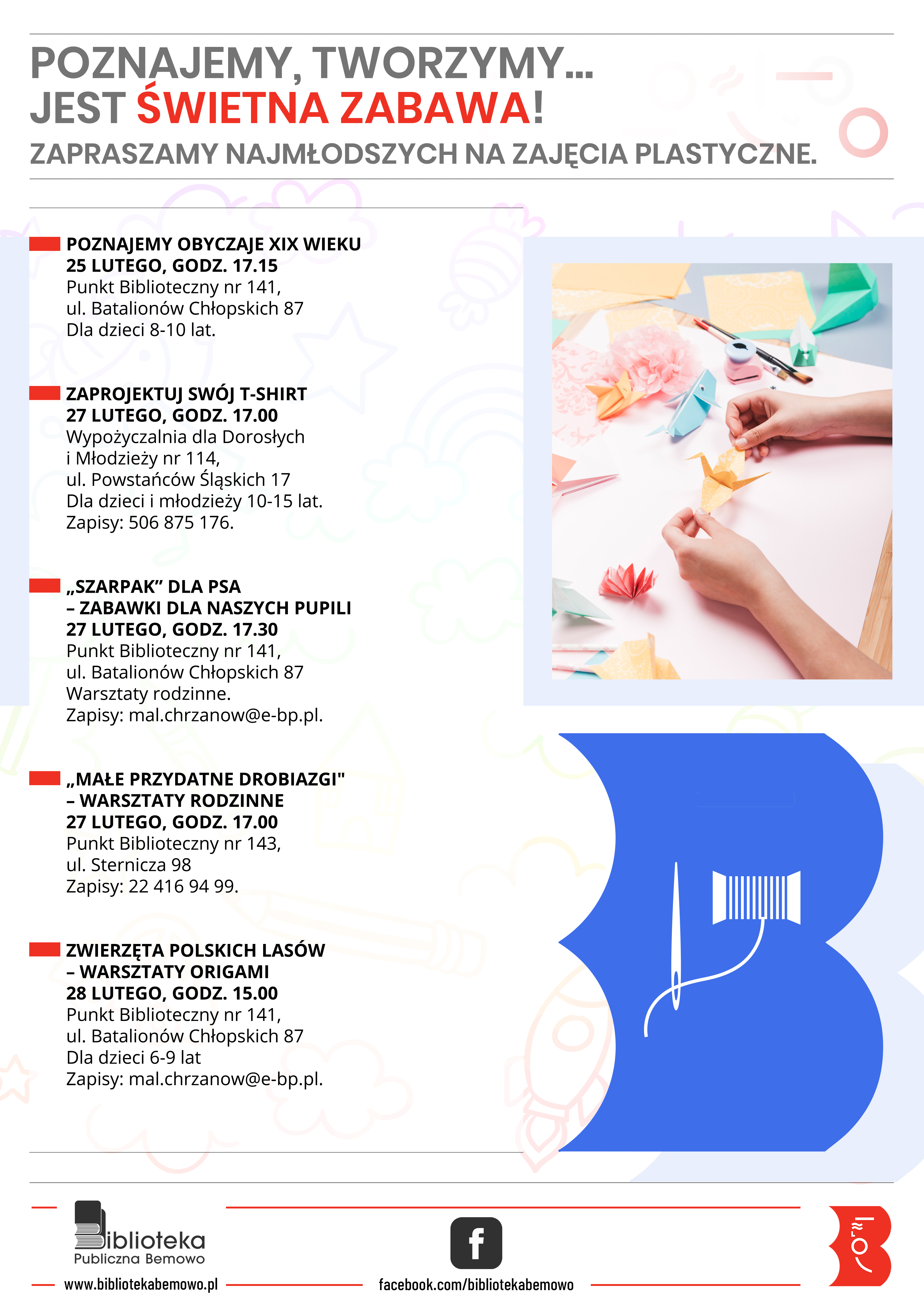 Proponowane w naszych placówkach warsztaty plastyczno-literackie prowadzone są w formie zabawy. Ich celem jest rozwój i pobudzanie kreatywności najmłodszych czytelników. Podczas spotkań będziemy rozwijać dziecięcą wyobraźnię i zdolności manualne.