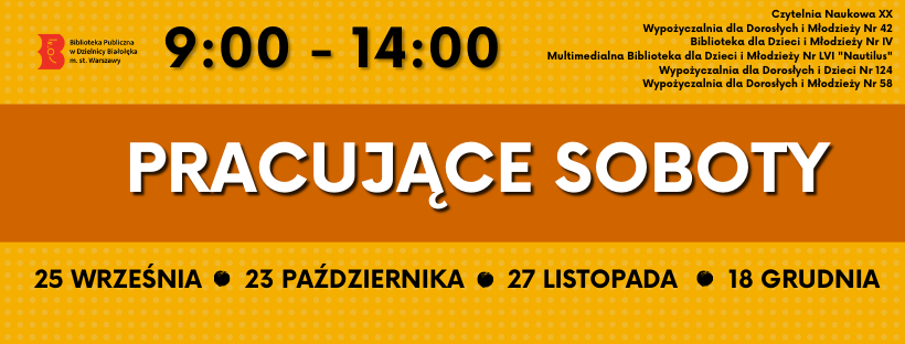 Drodzy Czytelnicy! Wybrane placówki Biblioteki Publicznej na Białołęce będą otwarte w niektóre soboty. Zapraszamy od 9:00 do 14:00 do: