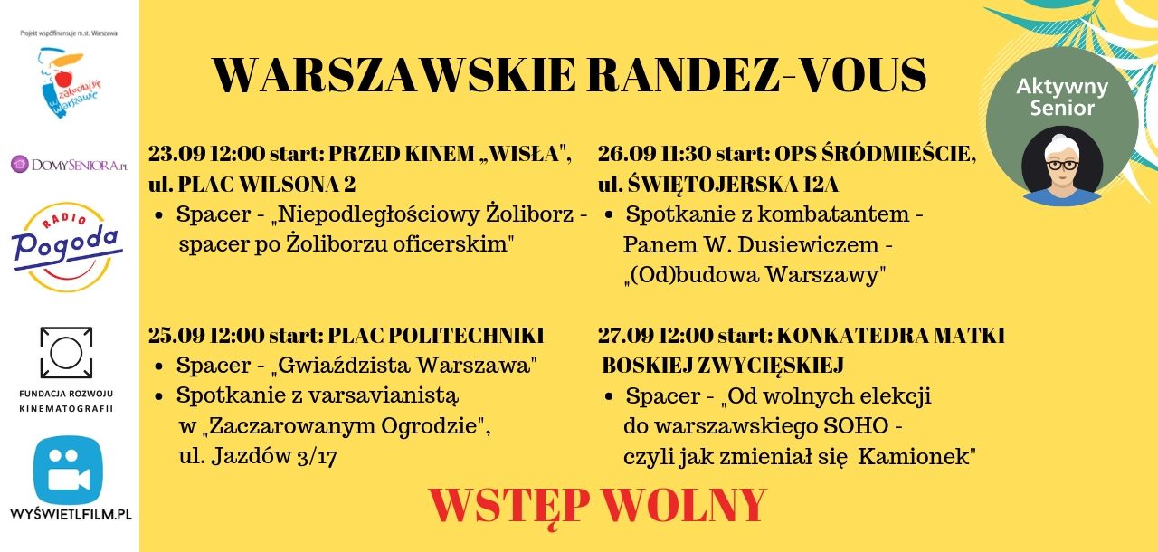 Urząd Miasta Stołecznego Warszawy wraz z Fundacją Rozwoju Kinematografii organizuje już trzecią edycję projektu „Aktywny Senior” w ramach Warszawskich Dni Seniora. Cykl obejmuje spacery varsavianistyczne, spotkanie z kombatantem oraz potańcówkę międzypokoleniową.