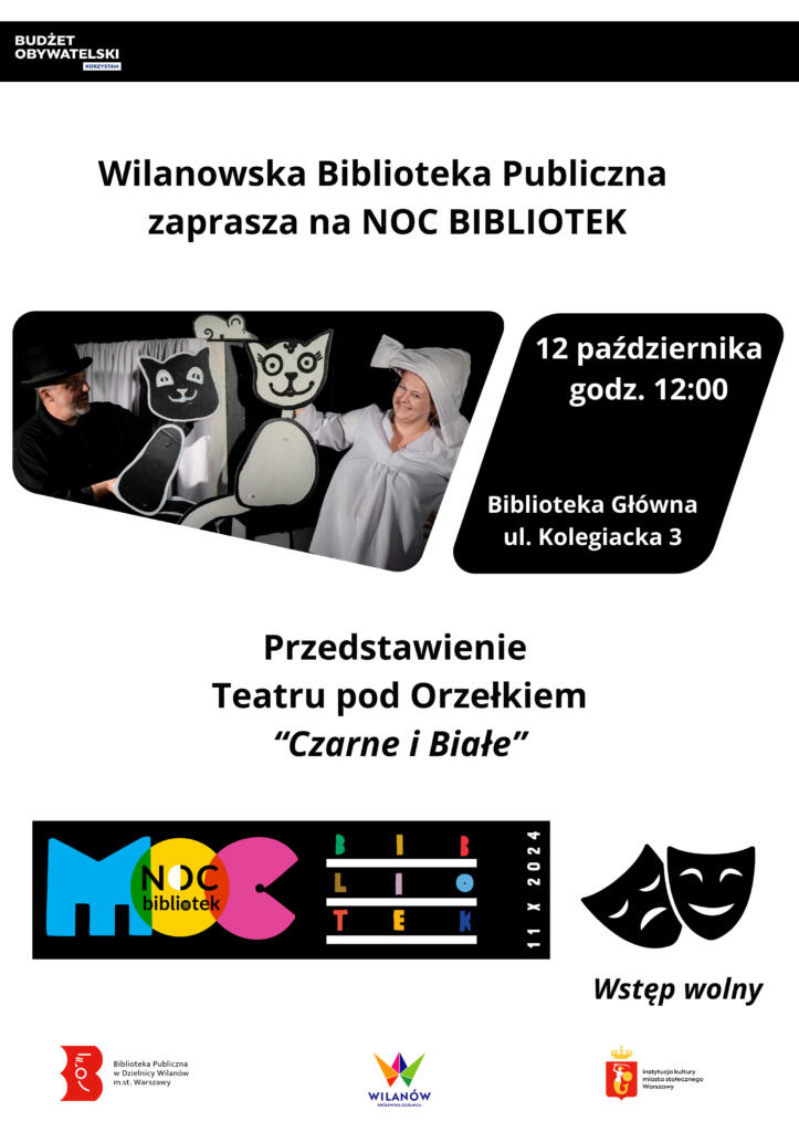 białe tło, zdjęcie aktorów ze spektaklu, grafika nocy bibliotek, dwie czarne teatralne maski, informacja o wydarzeniu, logotypy.