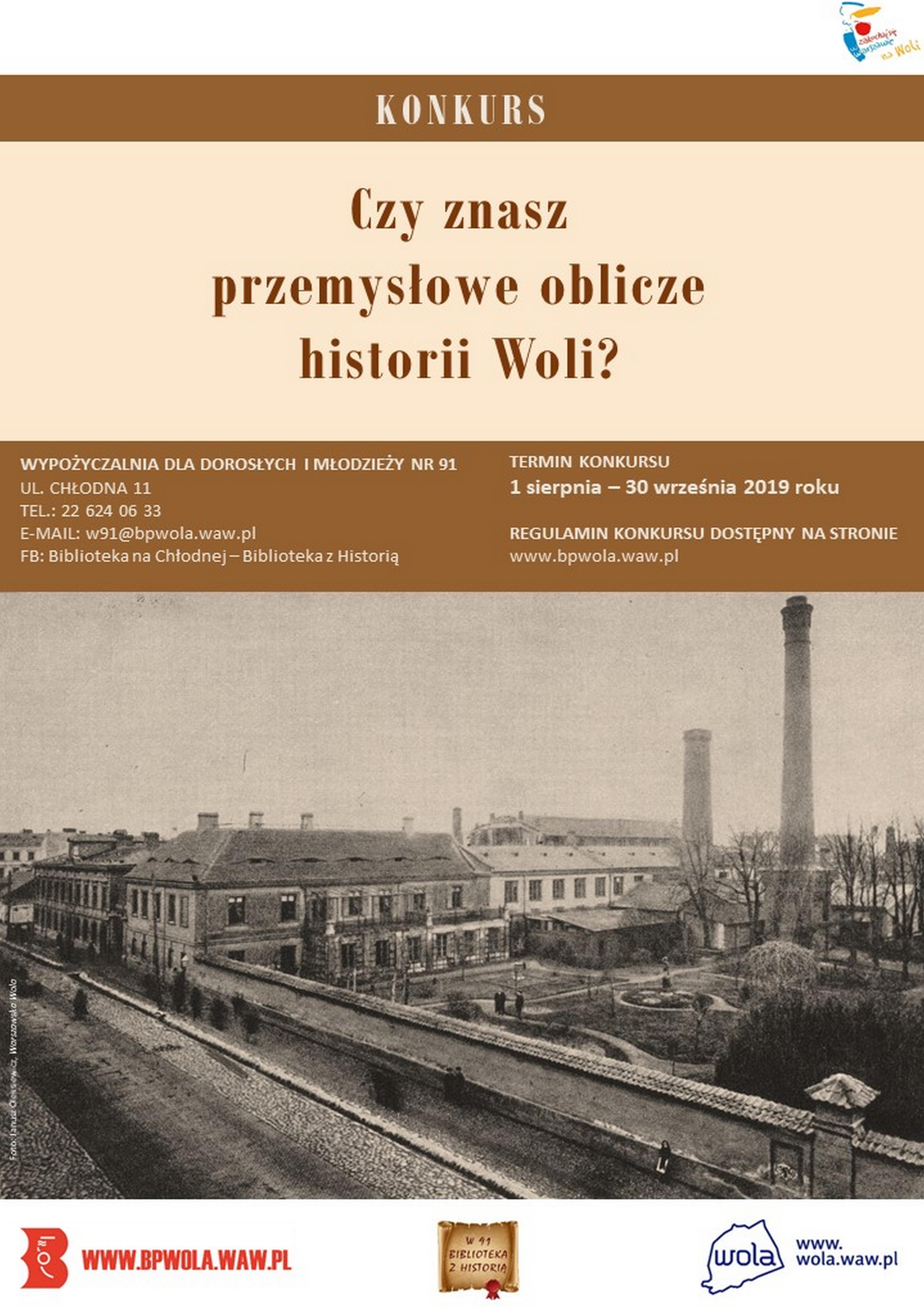 Zapraszamy do udziału w konkursie “Czy znasz przemysłowe oblicze historii Woli?”, zorganizowanym przez Wypożyczalnię dla Dorosłych i Młodzieży nr 91 przy ul. Chłodnej 11.
