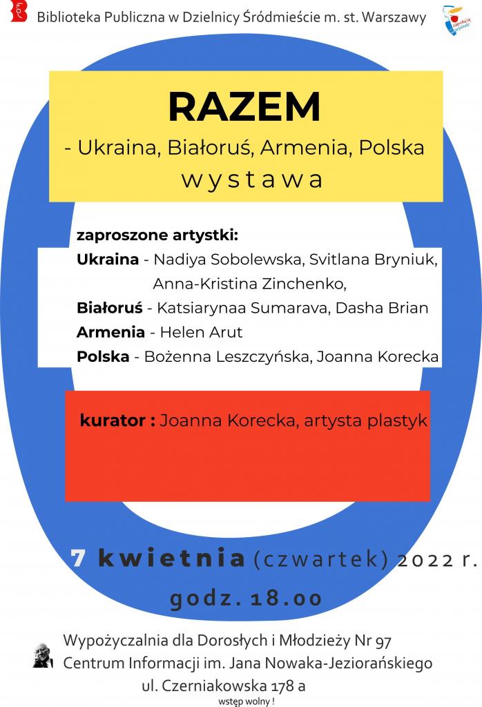 Od 7 kwietnia (czwartek) w Centrum Informacji im. Jana Nowaka-Jeziorańskiego przy ul. Czerniakowskiej 178a prezentowana będzie wystawa pt. „Razem – Ukraina, Białoruś, Armenia, Polska”. Zaproszone artystki to Nadiya Sobolewska, Svitlana Bryniuk, Anna-Kristina Zinchenko, Katsiarynaa Sumarava, Dasha Brian, Helen Arut, Bożenna Leszczyńska, Joanna Korecka. Kuratorem wystawy jest Joanna Korecka, artysta plastyk.