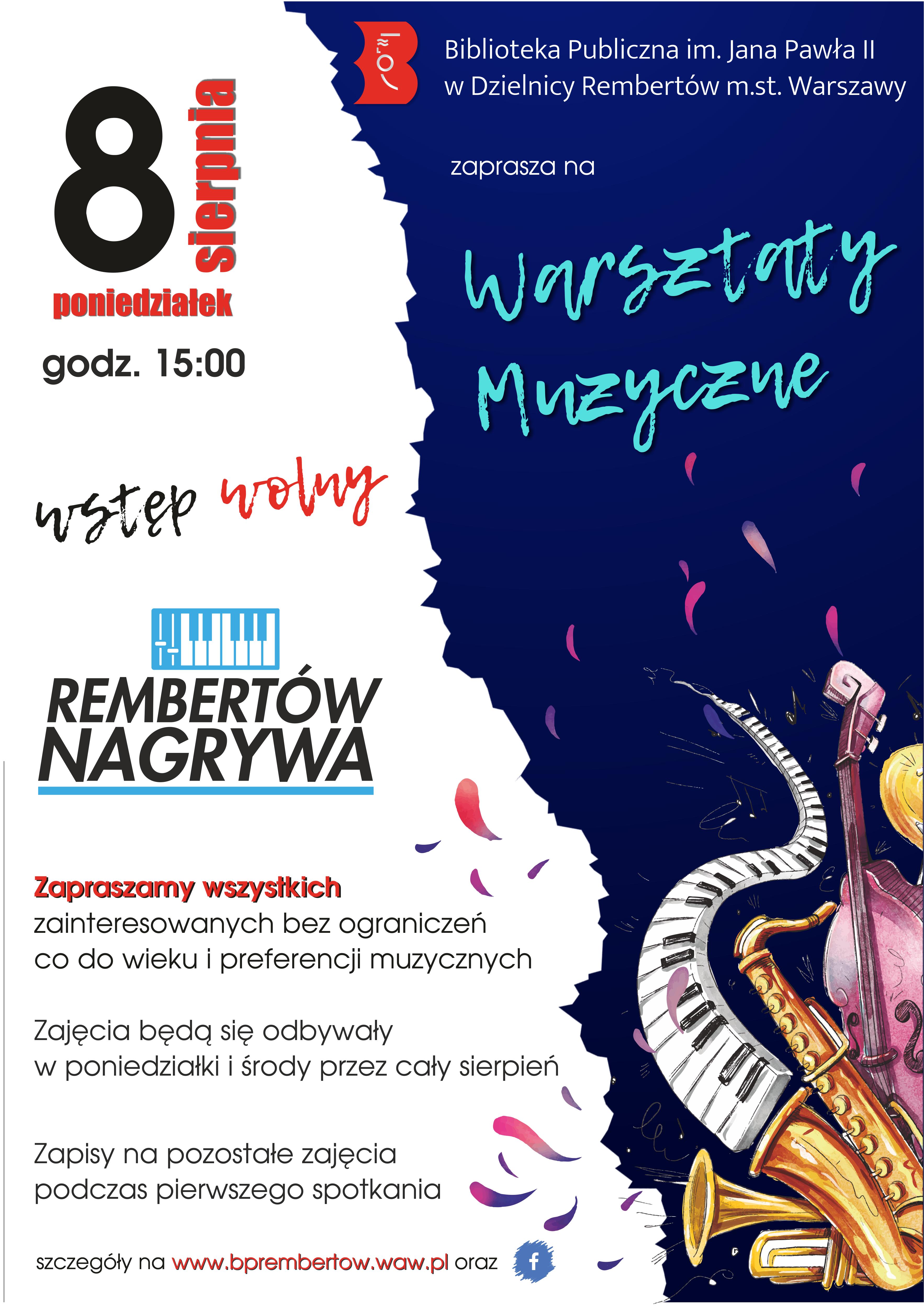 Zapraszamy na cykl warsztatów muzycznych, który rozpocznie się 8 sierpnia o 15:00 w bibliotece przy ul. Gawędziarzy 8. Na pierwsze spotkanie nie obowiązują zapisy. Następne warsztaty odbędą się w poniedziałki i środy sierpnia. O ich przebiegu i formie udziału poinformują prowadzący podczas pierwszych zajęć.