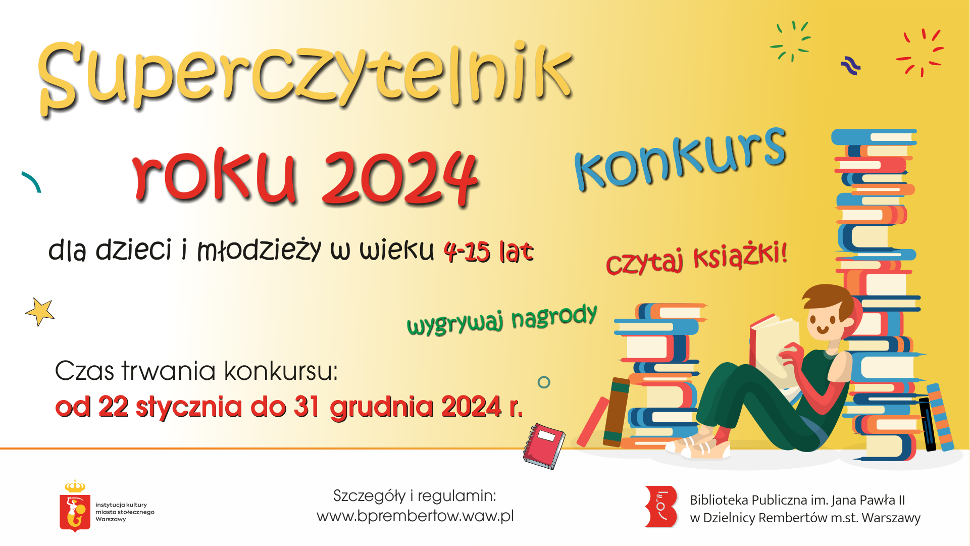 Masz od 4 do 15 lat? Lubisz książki i nutkę rywalizacji? Weź udział w konkursie rembertowskiej biblioteki i zdobądź tytuł „Superczytelnika roku 2024”. Wyzwanie czytelnicze potrwa do 31 grudnia 2024 roku. Czytelnikami Roku w trzech kategoriach wiekowych zostaną osoby, które wypożyczą i przeczytają najwięcej książek. Na zwycięzców czekają nagrody. Czytaj, odwiedzaj bibliotekę, zbieraj punkty, baw się!