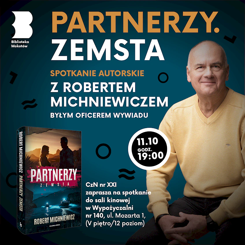 W ramach Nocy Bibliotek 2024 Biblioteka Mokotów zaprasza na spotkanie autorskie z Robertem Michniewiczem, który opowie o swojej najnowszej powieści pt. „Partnerzy. Zemsta”. W trakcie spotkania autorskiego uchyli tajemnice działań wywiadu oraz metod pracy stosowanych przez agentów. Opowie o książkach sensacyjnych i sekretach ich pisania, ale również w miarę możliwości o własnych dramatycznych przeżyciach w terenie.