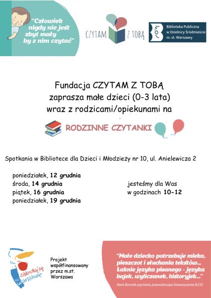 Biblioteka dla Dzieci i Młodzieży nr 10 i Fundacja Czytam z Tobą zapraszają małe dzieci (do 3 lat) na rodzinne czytanki.