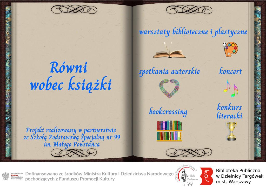 Projekt „Równi wobec książki” realizowany jest przez Bibliotekę Publiczną w Dzielnicy Targówek m.st. Warszawy w partnerstwie ze Szkołą Podstawową Specjalną nr 99 im. Małego Powstańca.