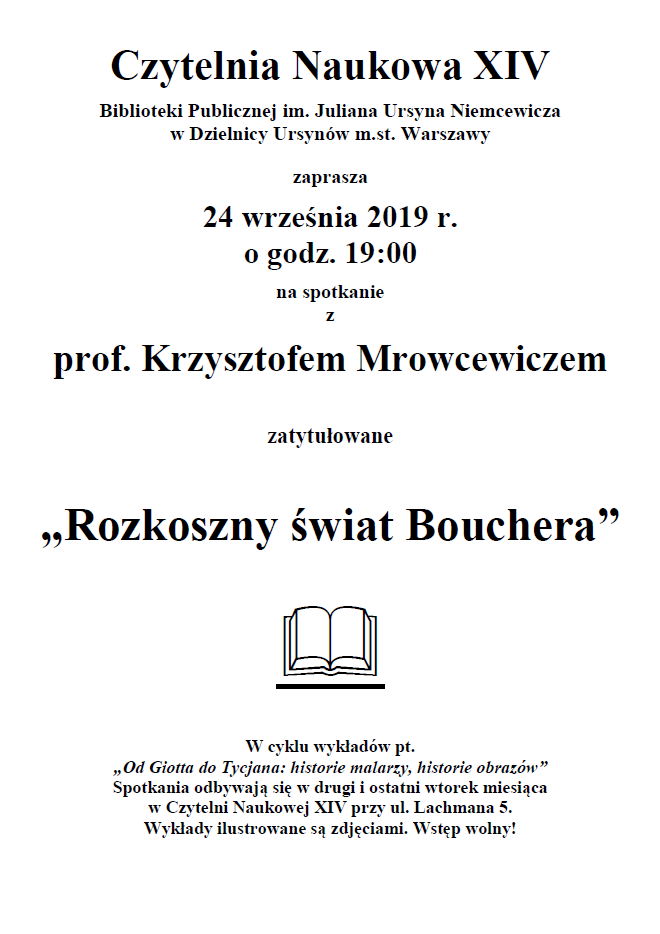 Czytelnia Naukowa XIV przy ul. Lachmana 5, zaprasza na kolejne spotkanie z prof. Krzysztofem Mrowcewiczem pt. „Rozkoszny świat Bouchera” w ramach cyklu “Od Giotta do Tycjana: historie malarzy, historie obrazów” w dniu 24 września (wtorek) o godzinie 19:00.