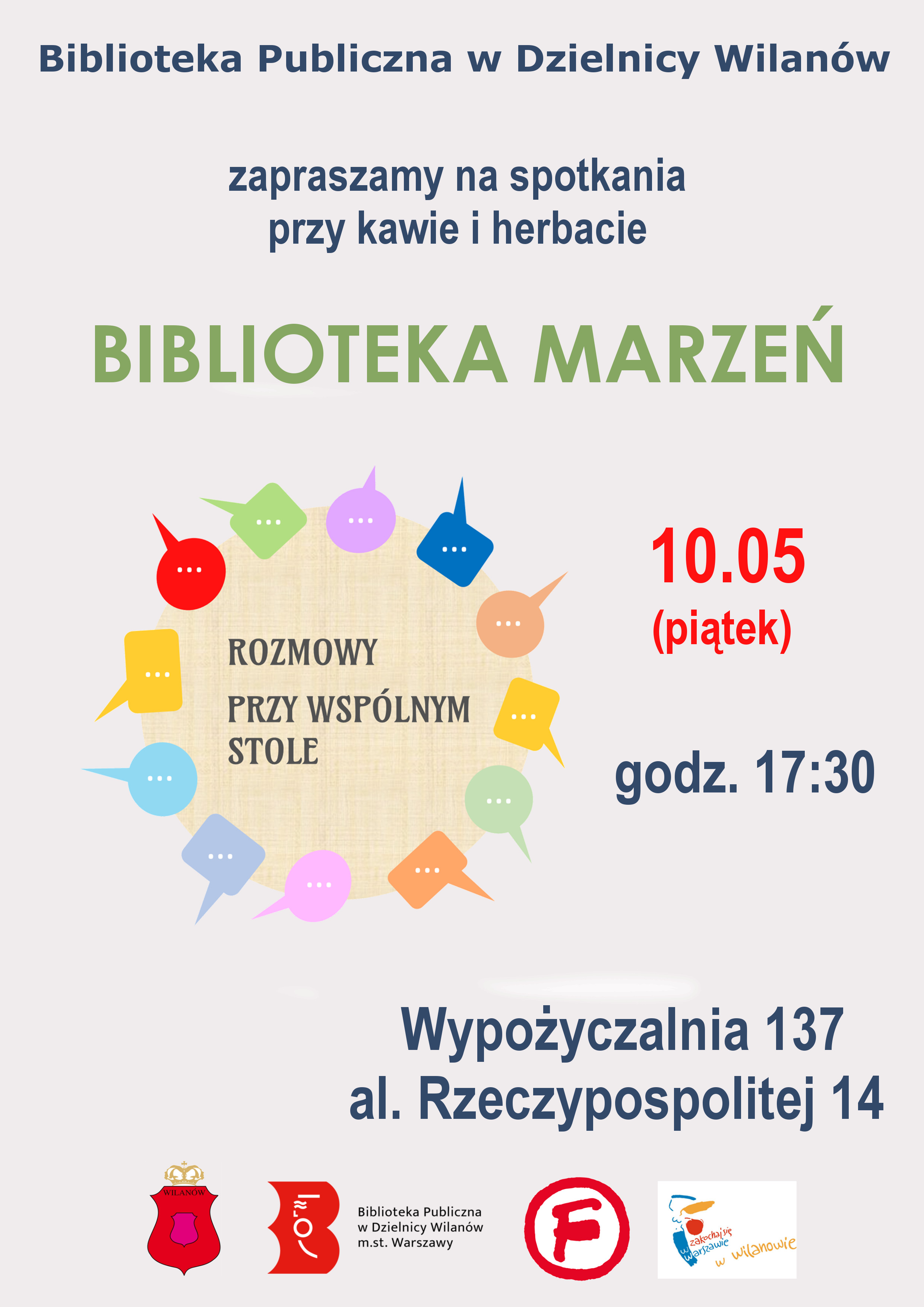 10 maja (piątek) 2019, o godzinie 17:30 filia w Miasteczku Wilanów (al. Rzeczypospolitej 14), zaprasza na kolejną odsłonę „Rozmów przy wspólnym stole”, których tematem będzie „Biblioteka marzeń„.